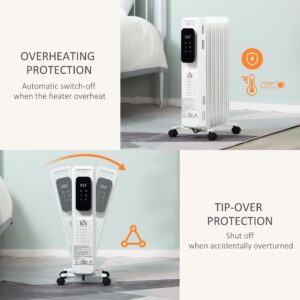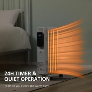 – MULTIPLE HEAT SETTINGS: Three heat settings (600W/900W/1500W) and ECO mode, and adjustable temperature settings (59-95°F) to achieve customized warmth on this radiator without worrying about huge energy bills. The LED display and smart touch switch makes operation easy.- QUIET OPERATION & TIMER: The oil radiator brings you constant warmth without the noise of a fan that can disturb you from sleep, work or conversation. A 24H timer and remote control is included so you can change the settings from the comfort of your own bed or couch.- EASY PORTABILITY: The space comes with 4 rolling caster wheels so you can just grab the carrying handle and bring it to whatever room you need it in.- TO USE: Overheat protection includes a -over switch to ensure the oil filled radiator instantly switches off to potential danger. There is also an -freeze setting to help the unit from seizing in cold conditions.- RADIATOR INFORMATION: Overall Dimensions: 13.5″ L x 9.5″ W x 24.75″ H, Power: 600W/900W/1500W. Suitable for area of 97-161ft2.