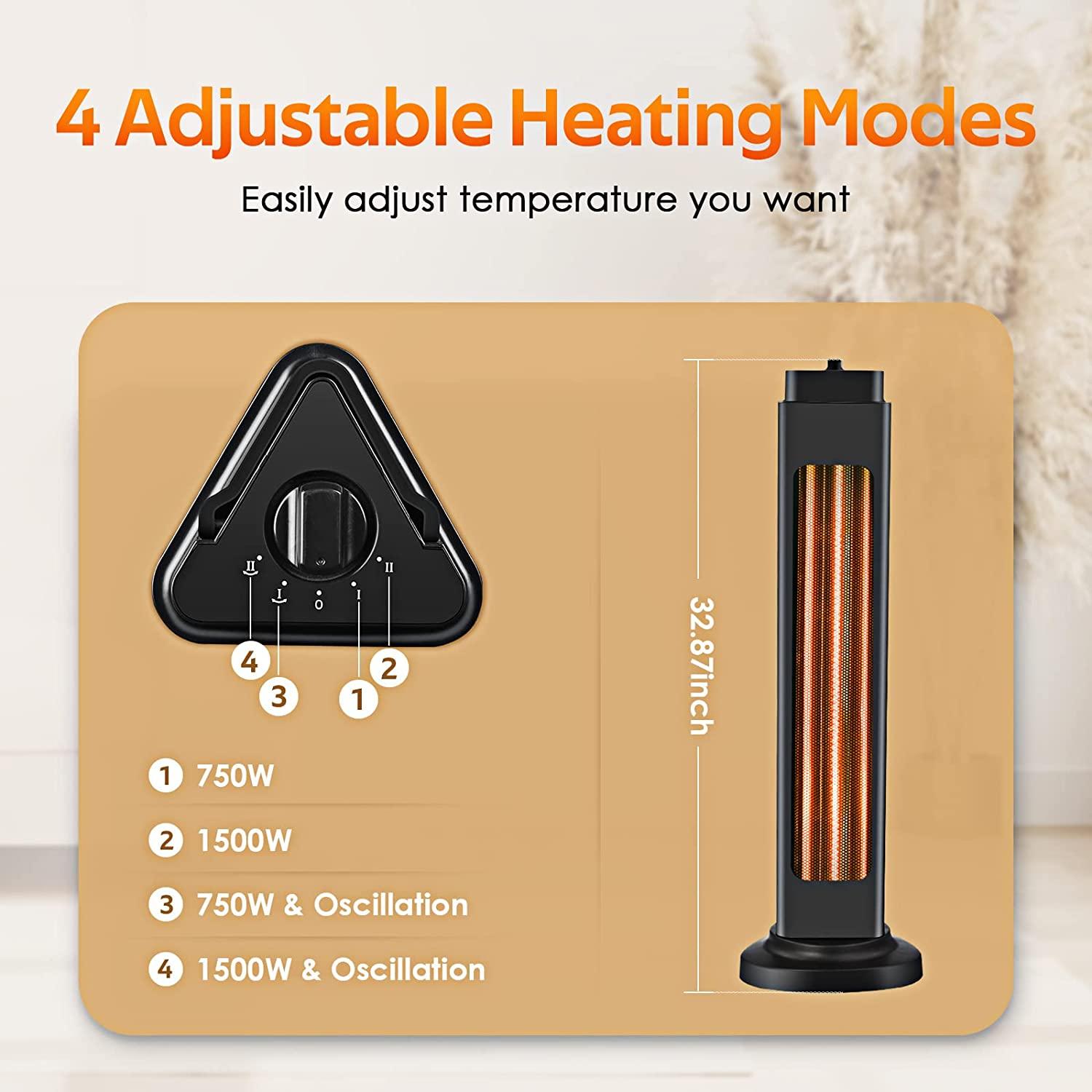 - Fast Heating and 4 Heating Modes: The patio heater has 4 adjustable heat setting modes to satisfy your different needs: 750W, 750W+Oscillation, 1500W, 750W+Oscillation; With carbon fiber heating tubes and optional widespread oscillation, the outdoor heater can evenly and quickly disperse warmth to cold spots in your home, apartment, garage and any room up to 400 sq. Ft