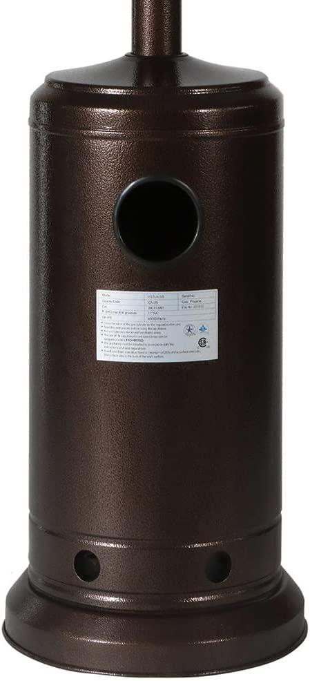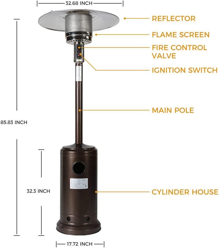 - 3.【86-Inch Height & Safe Design】The burner is situated high above the base for safe operation, avoiding accidental contact and burns.The patio heaters use 20 lbs propane tank (not included) and which add weight to the Base of the gas patio heater providing much needed stability and safety during windy conditions, also you can fix the outdoor heater base on the deck by screws,The patio heater has Safety auto shut off tilt valve and Safety auto shut off when the gas run out.