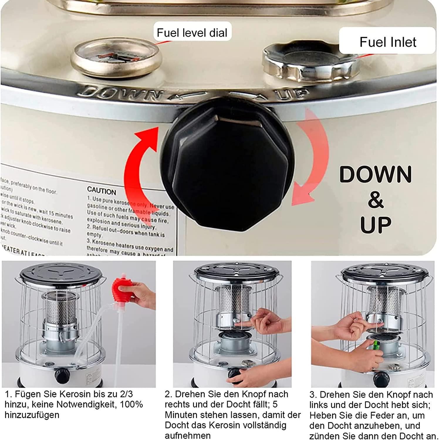 - ✿ Safe to use: Contains a kerosene plan so you can check fuel consumption at any time. With tilt angle automatic shut-off (anti-tilt), automatic erase function and hypoxi protection for safe use indoors and outdoors.