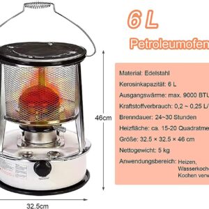 - ✿ Energy saving: Fuel consumption of only 0.2 – 0.25 L/h and heats longer (approx. 24~30 hours). The maximum heat generation is 9000 BTU/H (equivalent to 3000 W). It can quickly heat up a room of about 15-20 square meters.