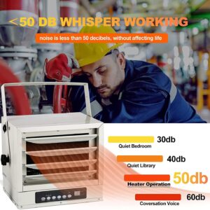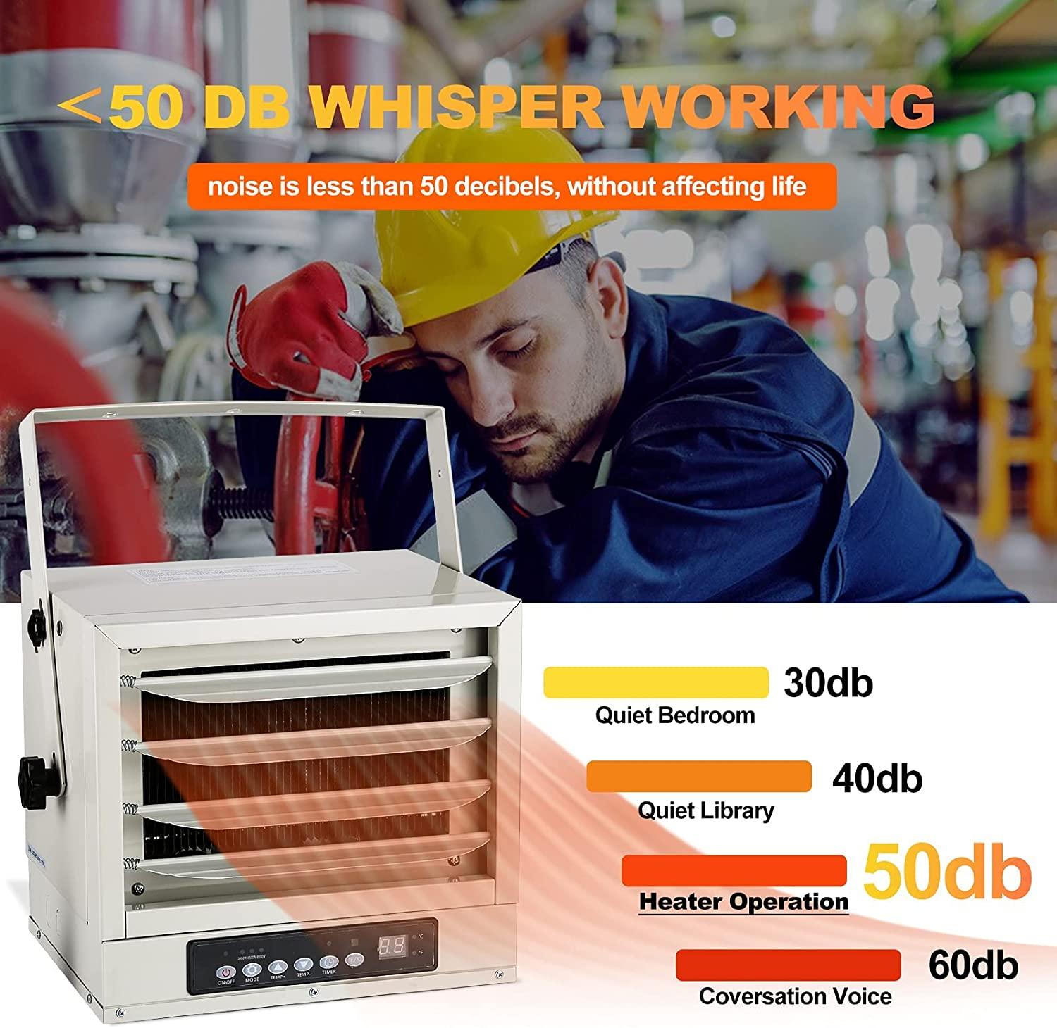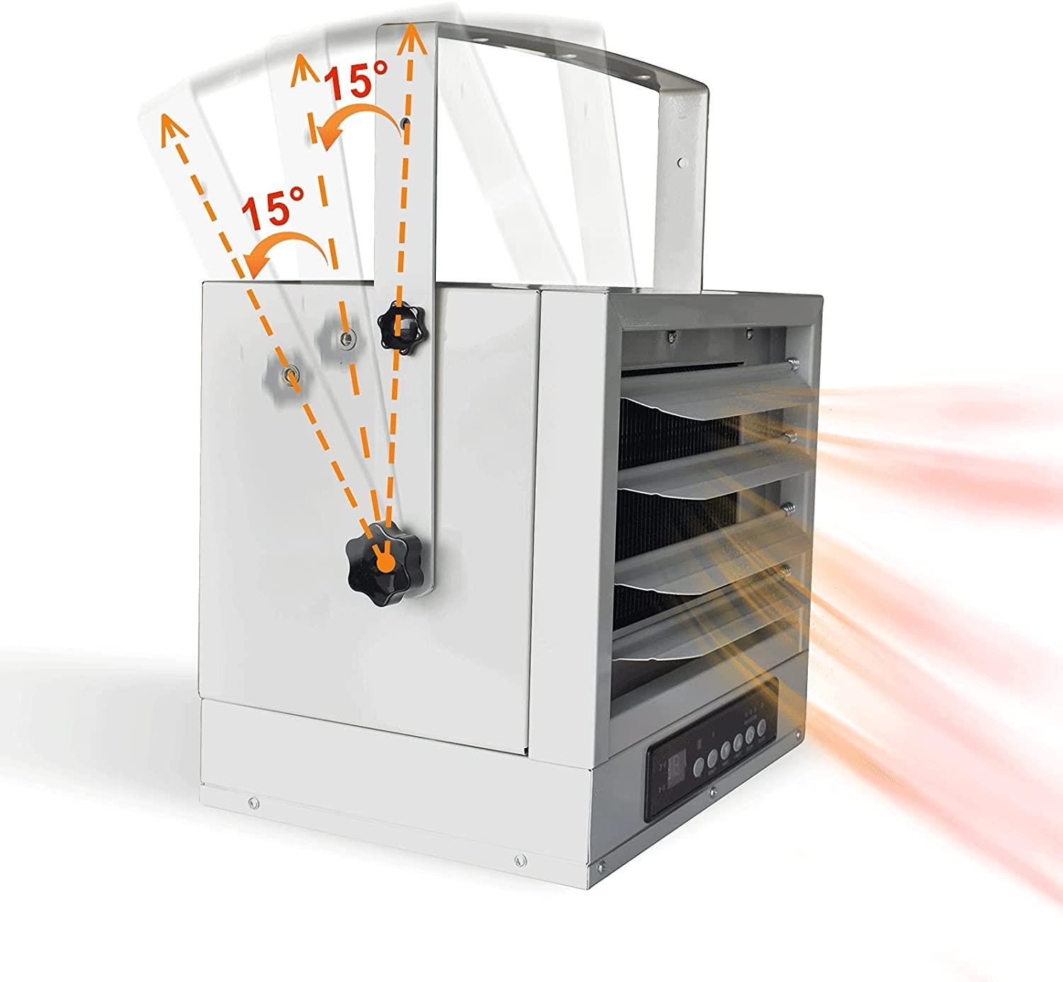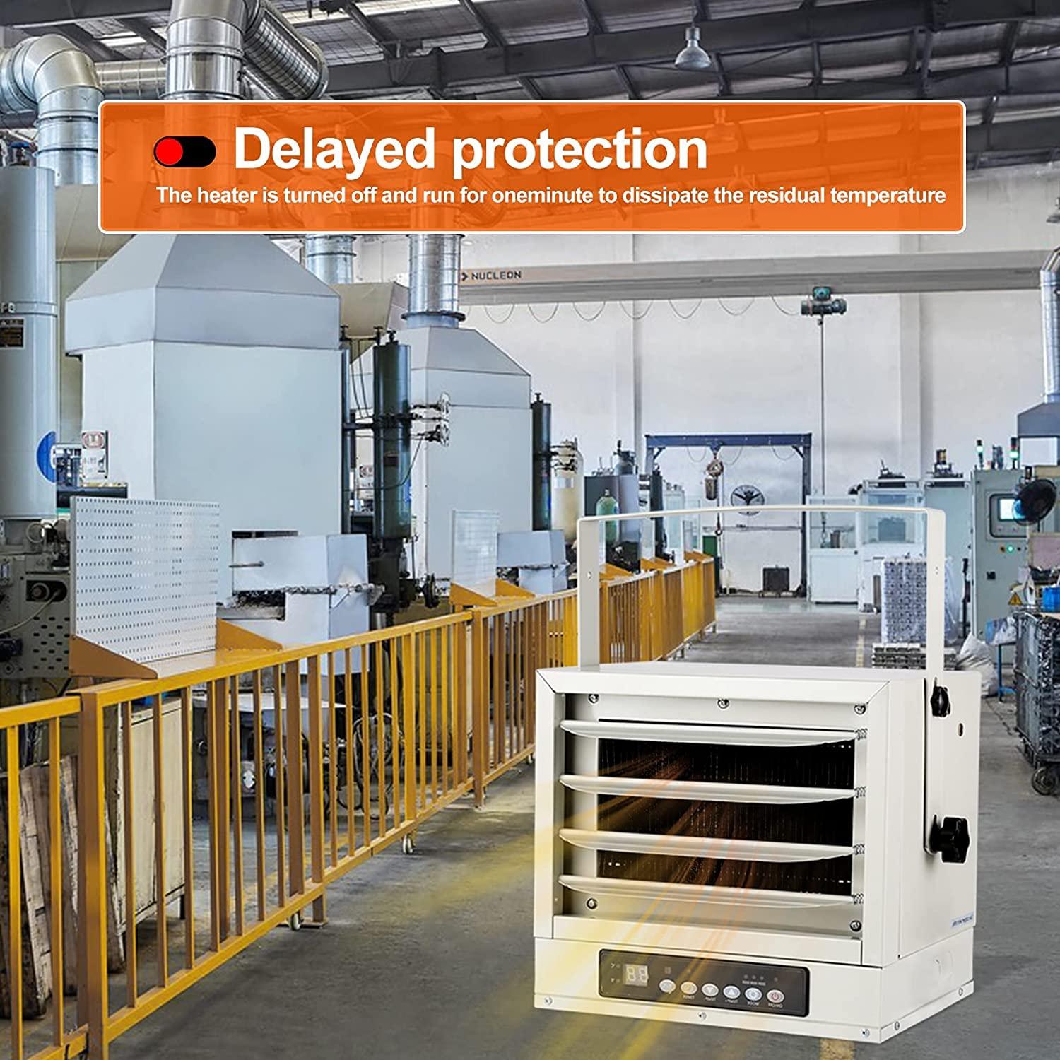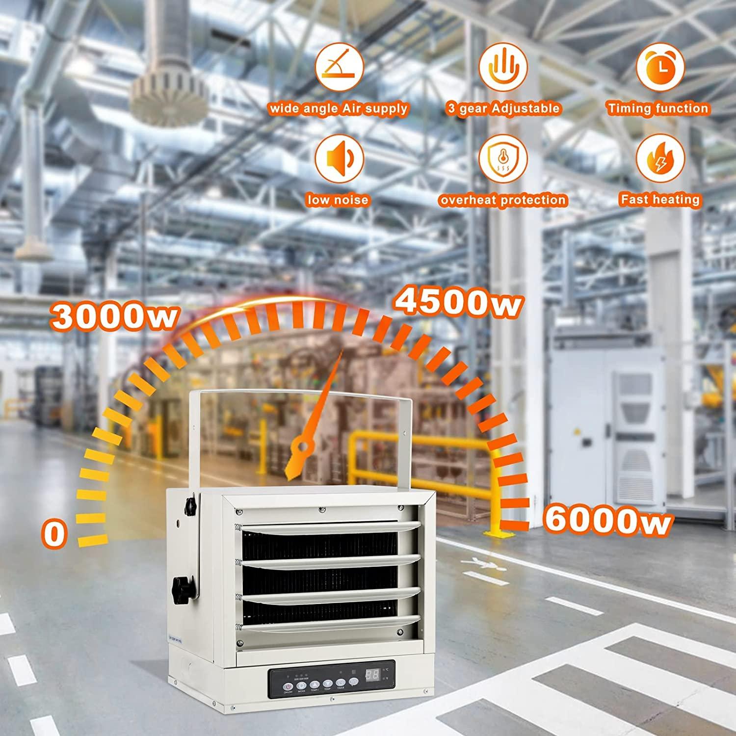 - 【OVERHEAT PROTECTION】: The Electric garage heater has a built-in thermostat, which makes the product with overheat protection, that is, when the product reaches an abnormally high heat will automatically power off, the power indicator will also turn off, to ensure that you know whether the equipment is in use. At the same time, you can choose a total of 3 levels of heat, respectively 3000/4500/6000W, according to your personal needs, you can choose the level of heat you need.
