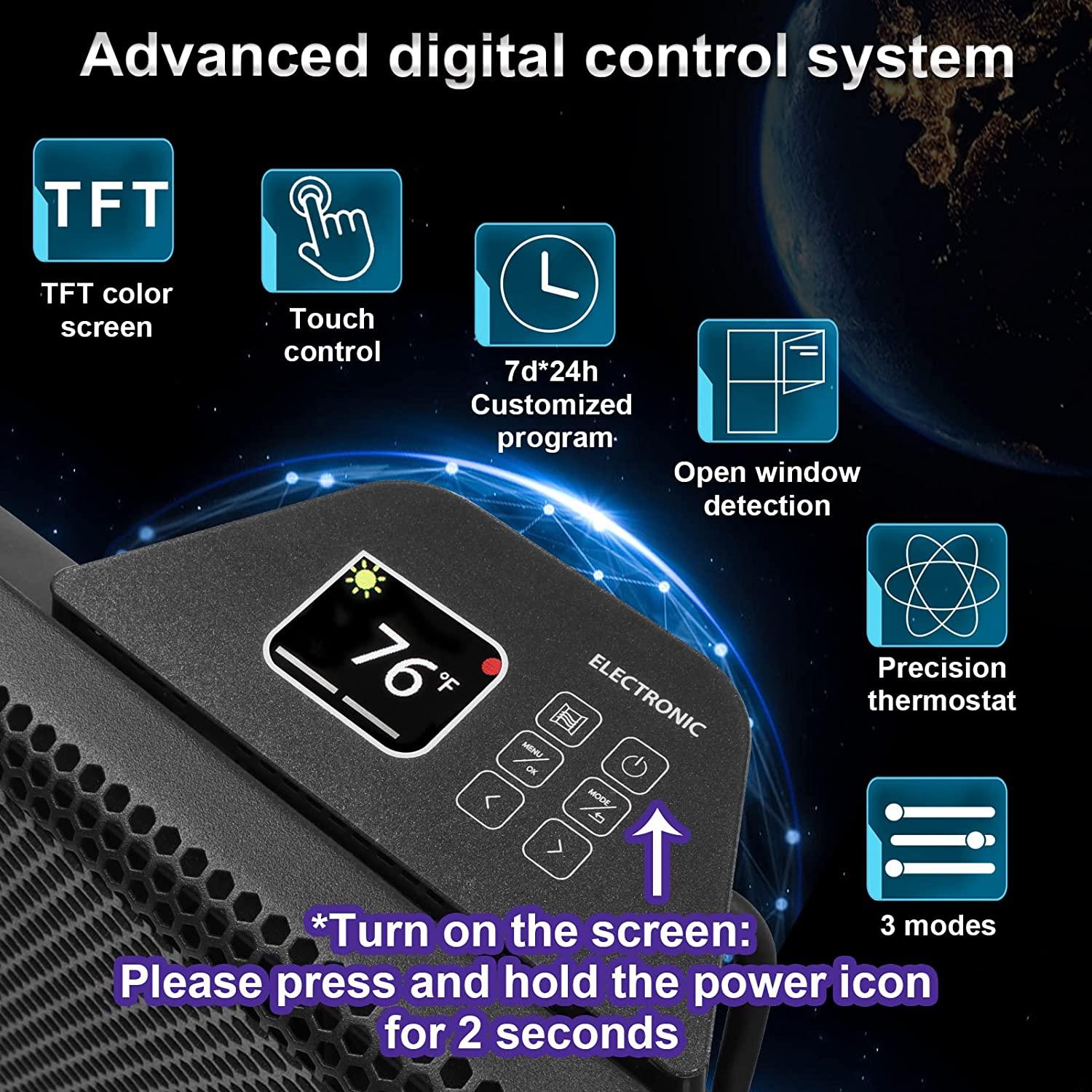 - TFT Digital Display control panel:The touch control panel is placed on top of the heater for easier reach,you can setting the temperature,power level,heat model,timer,eco mode,brightness level,sound on/off,children lock on it easily.