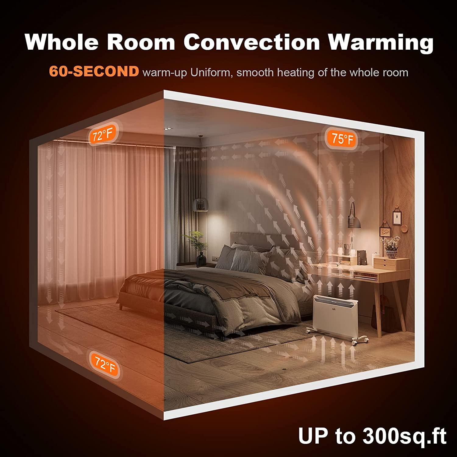 - Heat Up in 60s:You can feel the warmth after turn on the heater less than 60seconds.It takes about 1-2 hours to warm the whole room evenly,the exact time needed depends on the size and warmth of the room.Up to 300sq(almost 17×18) room.