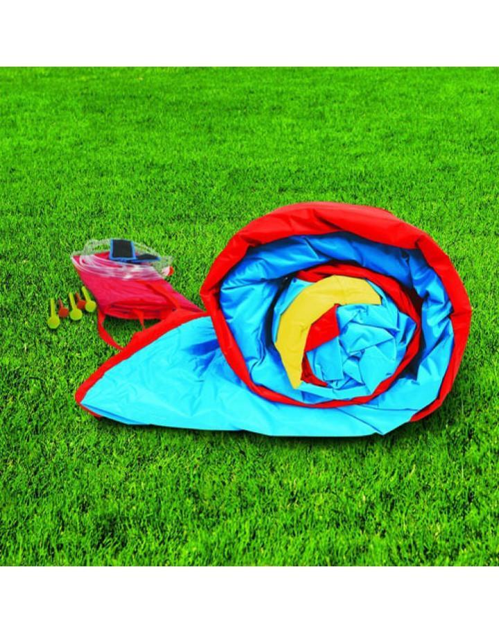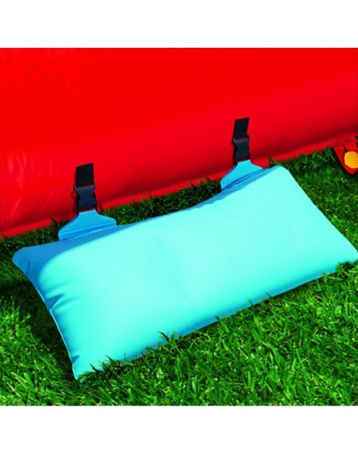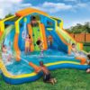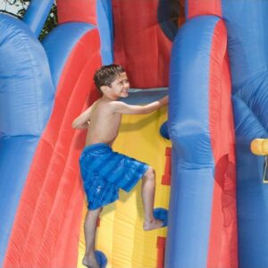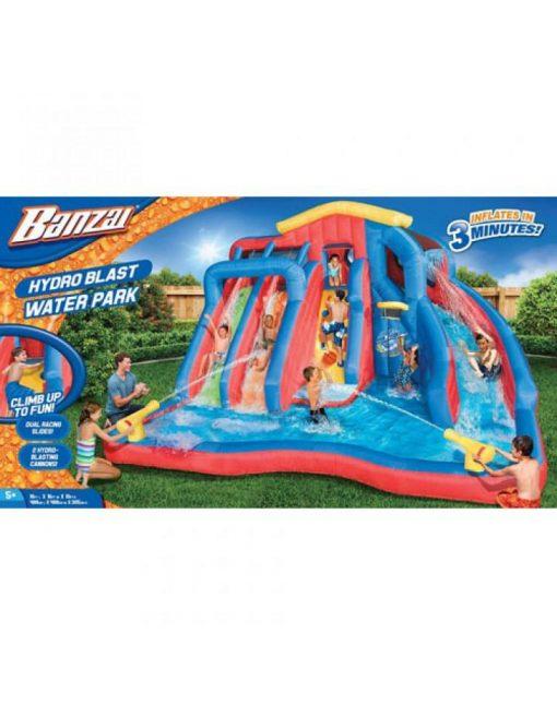 Product descriptionSlip, slide, blast, splash and more with the Banzai Hydro Blast Inflatable Water Park for hours of family fun! From the splash lagoon, climb up the climbing wall to the top of this fun inflatable and race a friend down the dual lane slides or the exciting curved slide. Make a splash and then play a pickup game of hoops or blast a water cannon. The whole thing stays inflated with the help of continuous airflow from the included blower motor, which inflates the structure in less than 3 minutes. Meanwhile, heavy duty Dura Tech construction ensures that the Banzai Hydro Blast Inflatable Water Park will withstand as much fun as you can throw at it. Product Dimensions ??? 15.5 x 18.5 x 36.8 inchesItem Weight ??? 84 poundsShipping Weight ??? 90 pounds?Features 2 water-blasting cannons, basketball hoop and inflatable ball3 slides total: dual racing slides and a extreme curved slideInflates in less than 3 minutes with the included blower motor16