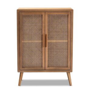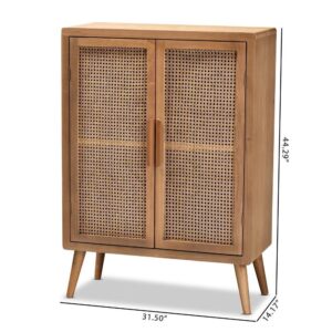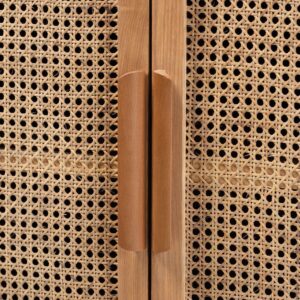 Cultivate a fresh, retro feel in any space with the Alina cabinet. This sturdy wood cabinet showcases a medium oak finish for a look that’s both warm and inviting. Two shelves, behind two doors, provide ample space to keep items organized and out of sight. Woven rattan adds a cool, bohemian vibe, while angled legs and long wooden handles lend mid-century charm. The Alina cabinet is made in China and requires assembly.
