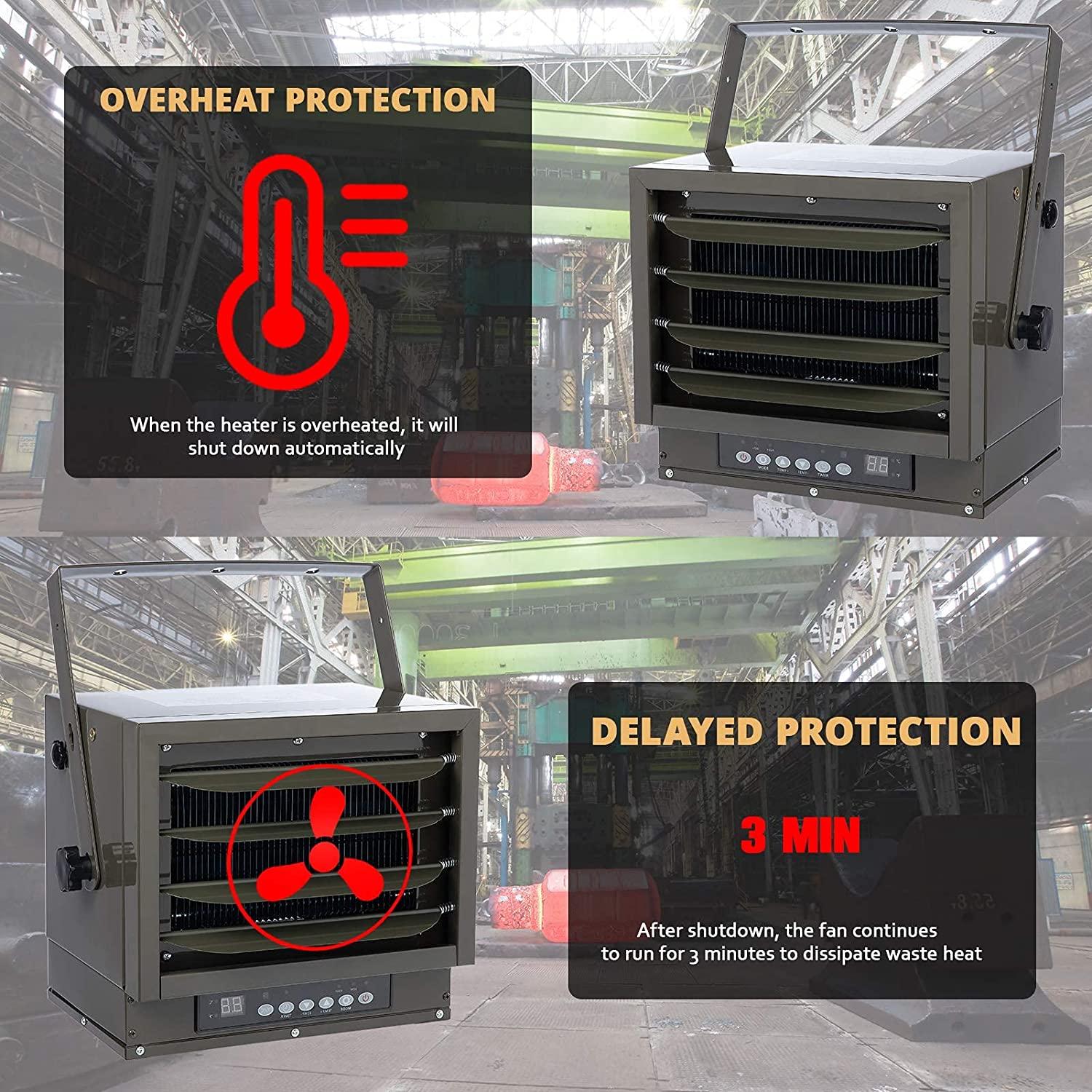 - Overheated Protection – Our garage heater is equipped with a built-in thermostat and a fuse. Once overheated, electric heater for garage & workshop will automatically turn off. When the abnormal temperature returns to normal, the heater will turn on again. In addition, the fan with delay protection Continue to run for 3 minutes after shutdown to dissipate the residual heat.