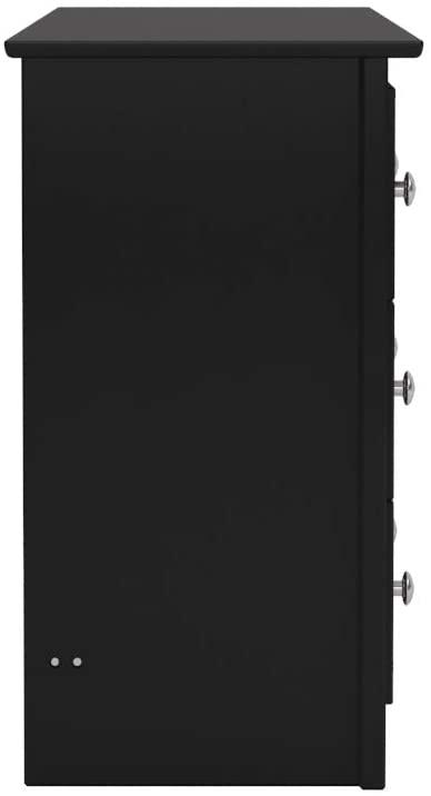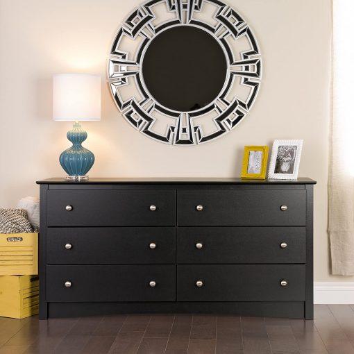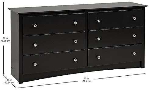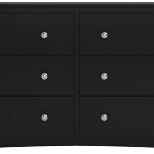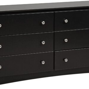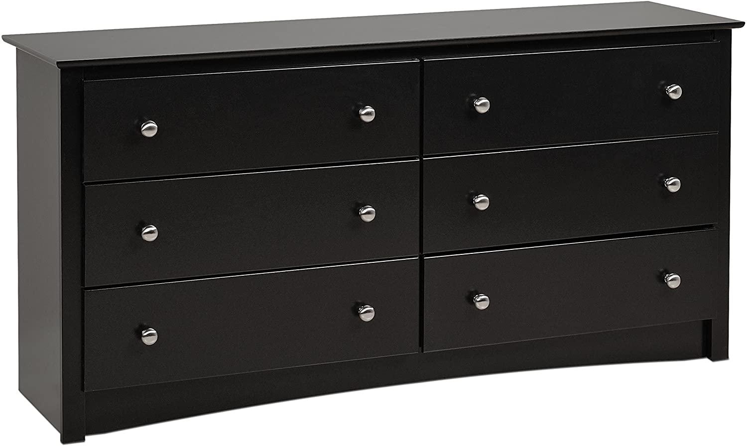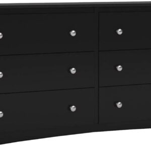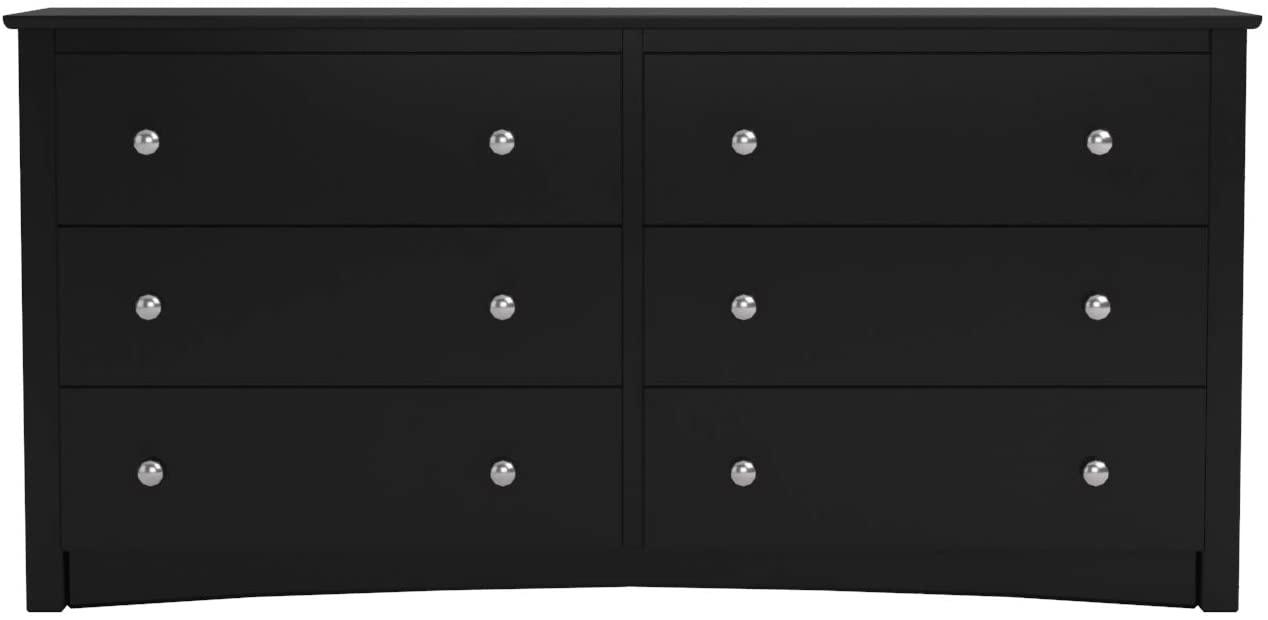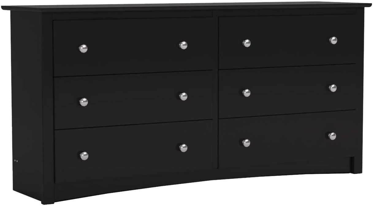 This 6-drawer dresser features six full-size drawers, a profiled top, side moldings and an arched kick plate. Other highlights include solid brushed nickel knobs and drawers that run on smooth, all-metal roller glides with built-in safety stops. As a higher quality Ready-to- assemble product, It is made from durable composite woods, and unlike other RTA furniture, has no plastic edge banding.