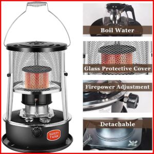 - ✱Fire Power Adjustment Knob: The kerosene heater has a rotary adjusting valve to adjust the fire power according to your needs; no noise and glare, easy to use. The heating station on top can be used as a work station to cook food. There is a protective net outside the small kerosene stove to effectively prevent burns.