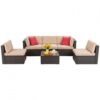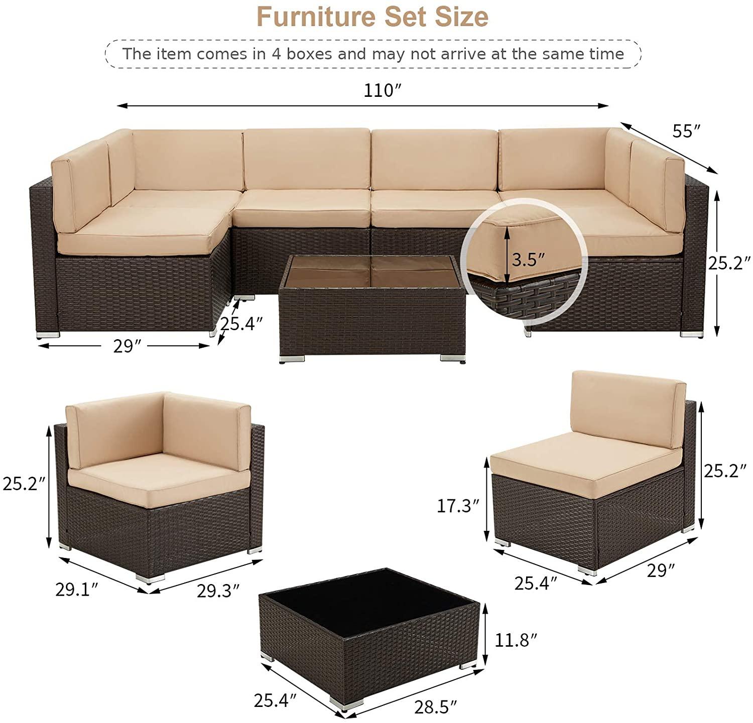 - ⛱️【Packing Included(7 Pieces set)】4 x Single armless chairs, 2 x Corner armchairs,1 x Coffee table with tempered glass top and 6 x seat&back cushions. Our 7 piece sectional wicker sofa set will arrive in multiple boxes with all necessary hardware and detailed instructions. Normally this sectional patio furniture set required 40-60 minutes to assembly by one person. What’s more, this outdoor furniture set have endless number of configurations, you can match and purchase freely as you need.