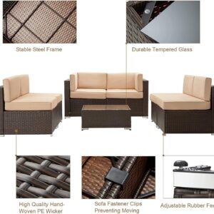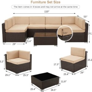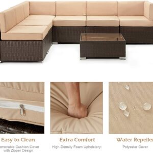 - ⛱️【Beautiful Wicker Style】This patio furniture set features brown PE rattan with khaki cushions, which is perfect addition to your patio, garden, backyard, pool, other indoor and outdoor space.This modern outdoor sectional sofa comes with enough room to seat 4-6 friends comfortably with a table to hold food and drinks. 17.3′′ seating height make the chair more comfortable.