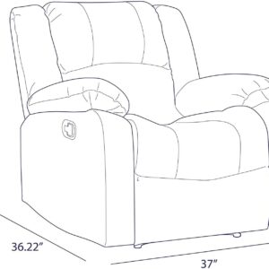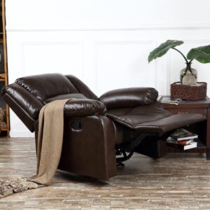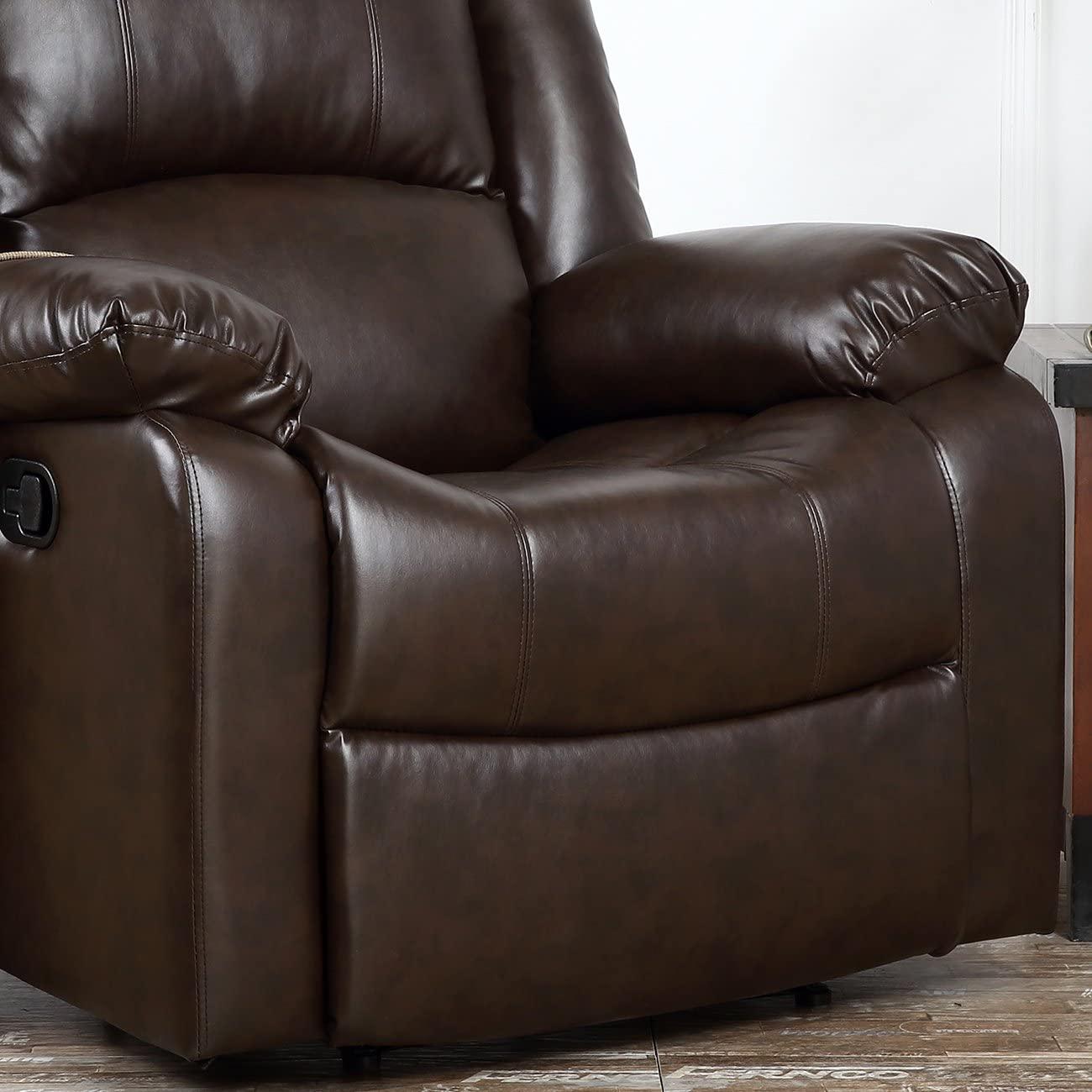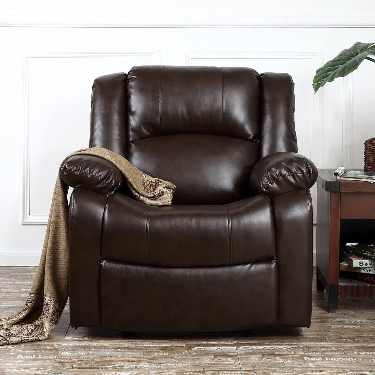 Treat yourself to a relaxing recliner with the recliner Club chair by. Featuring beautiful Brown faux leather & a sturdy wooden frame, This piece is both luxurious & durable. The dual-function operation allows you to recline and raise the footrest for ultimate leisure. &Nabs; feature: upholstered sofa chair with premium soft foam padded headrest, armrests, backrest, and footrest, giving you a supportive and comfortable cloud-like seat let the classic charm and modern convenience of this gorgeous reclining armchair complete your home today soft yet sturdy recliner makes an ideal addition to any living room, bedroom or Entertainment area functional design and comfortable exterior blends well in casual and contemporary settings internal mechanism makes reclining easy single recliner looks great in any setting built to last for long-term use, The frame of the sofa chair consists of high-quality wood and metal, a great durability conveniently located side hand lever that allows for easy positioning and reclining perfect for any home corners, &nabs; attractive, stylish, elegant chairstain-resistant faux leather upholstery specifications: Color: Brown pattern: solid Material: Faux Leather chair Type: reclinersrecline flat: no Armrest Height: 24-3/Armrest Width: 7-1/4′′seat size: 22-/2′′(W) x 21-1/2′′(l) seat Height: 19-1/4′′backrest: 35-1/2′′(W) x 25-1/4′′(h)fully recline length: overall dimension: 37-3/4′′(W) x 29′′(l) x 37-3/4′′(h)assembly required: Package include: recliner chair manual Note: The digital images we display have the most accurate color possible. However, due to differences in computer monitors, we cannot be responsible for variations in color between the actual product and your screen.