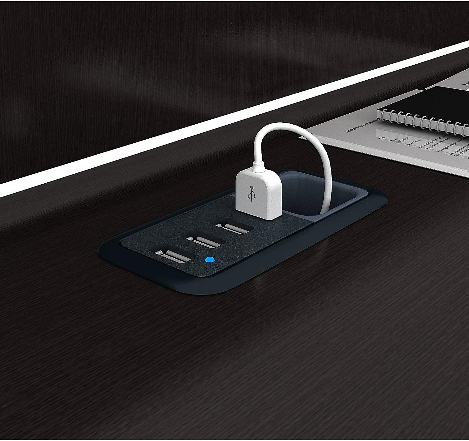 - Integrated 4-port USB hub keeps devices connected | Concealed storage cabinet in L Shaped Desk features stylish fluted glass door