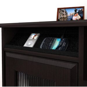 The Cabot L Shaped Desk with Hutch in Espresso Oak offers a spacious and efficient workplace for your home or office. Enjoy a beautiful traditional look with smart features for your convenience. The L Shaped Desk design provides a large durable work surface and just the right amount of storage to keep you feeling neat and organized. Desk storage details include an enclosed cabinet with stylish fluted glass door and a box drawer for supplies. A file drawer glides on smooth full-extension ball bearing slides and accommodates letter, legal or A4 sized files. Technology features such as a built-in 4-port USB hub add convenience while a soft tray in an open cubby can store electronic devices as you stay connected. The Hutch boasts a matching fluted glass door, two large open compartments and four work-in-process areas to help keep your Desk surface clutter free, along with a wire management system to control your cables. Quality construction meets ANSI/BIFMA test standards for safety and performance. A rich Espresso Oak finish accented by Chrome hardware provides a simple, elegant and timeless appearance. See the full collection for coordinating items available, all backed by the 1 Year Manufacturer’s Warranty. Accepts Cabot 60W Hutch (sold separately) on either side