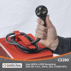 Comfort Zone 4800W Industrial, Electric, Portable Utility Heater, has Wide air distribution, Thermostat control, 4800-Watt portable electric heater can be adjusted for efficiency and personal comfort||Quality construction. The industrial heater has a heavy-gauge steel body for long-term durability that will keep up with the demands of any home or workspace. Easy portability: equipped with a convenient carrying handle and rubber feet, this portable heater is easy to move anywhere it’s needed the NEMA 6-30R power cord wraps around the handle for safe transportation. Safety performance: the overheat protection system on this space heater delivers added safety, ensuring that it won’t get dangerously hot during extended use .Perfect for heating in an industrial setting or your garage. Please note: the unit requires a 208-240-volt, 3-prong industrial outlet and will not work in standard household 120-volt outlets.