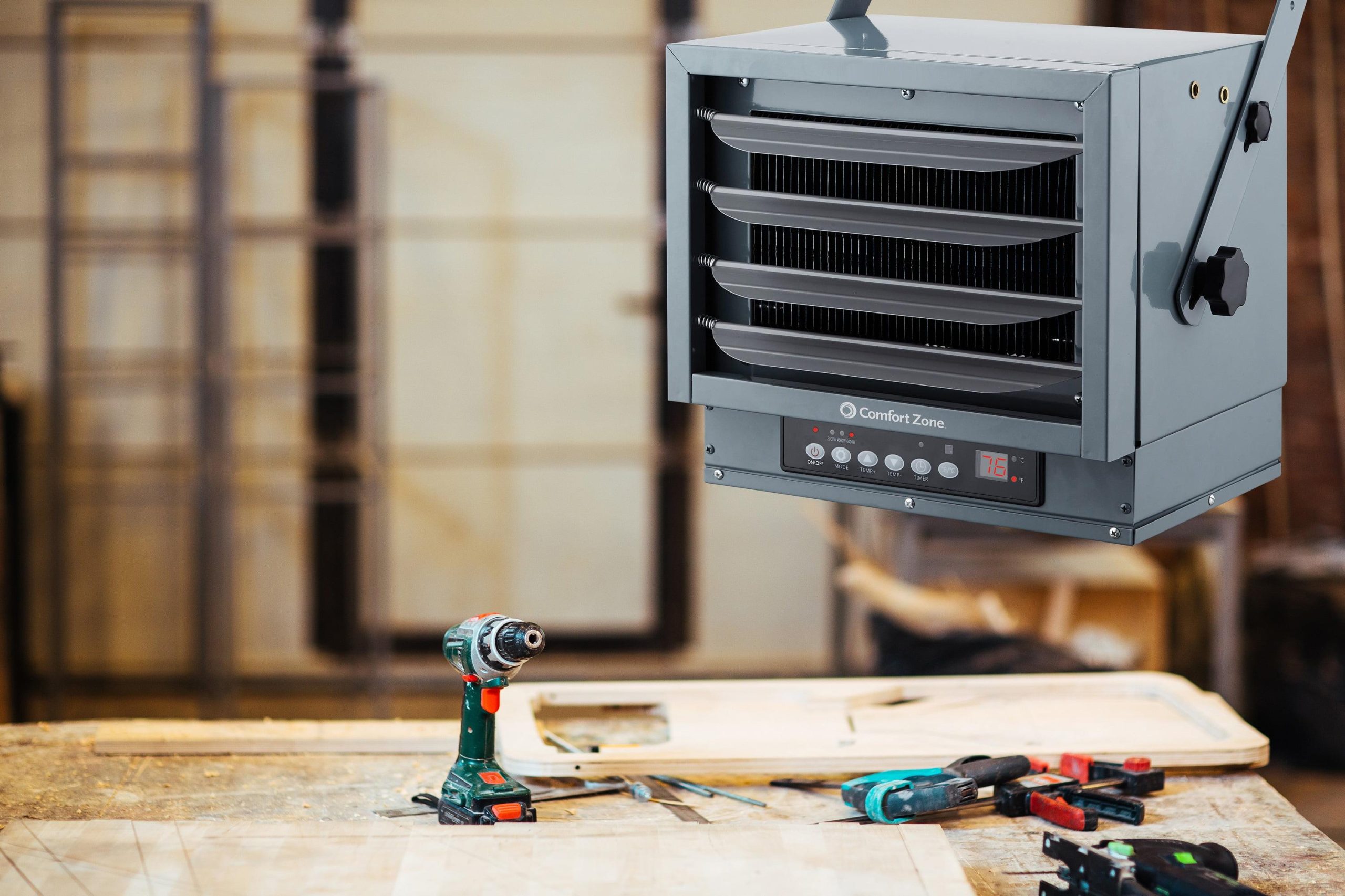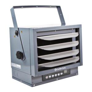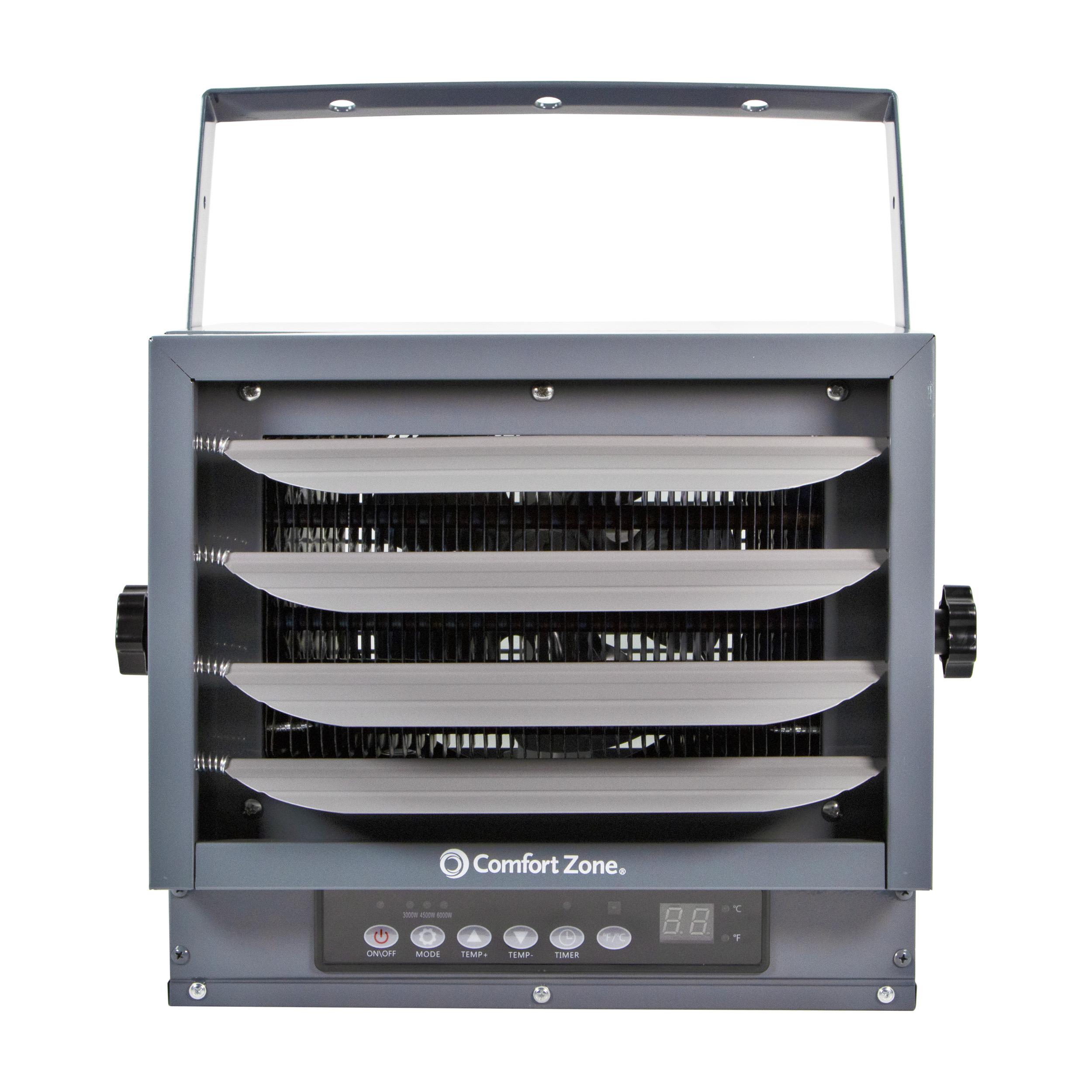 Comfort Zone Electric industrial heater in your workspace or in your garage. Designed for use in harsh environments and using fan-forced air operation, this ceiling-mounted heater distributes heat across a wide area to keep your space comfortable. It is crafted with a tough heavy gauge steel body allowing it to stand up to sudden temperature drops and spikes it can encounter in poorly insulated areas. Together with the integrated vent plates that can be adjusted to change the angle of airflow and the ceiling mounting bracket that is included, this heater can be adjusted to target the heat to where you need it most. The adjustable thermostat control on this ceiling heater offers customized heating output, optimizing performance to suit your environment and provide personalized comfort. Easily adjust the temperature on this 6,000-Watt space heater using the integrated digital thermostat control or with the easy to operate remote control from a distance. The 12-hour timer offers added convenience to allow you to run it for a set amount of time instead of switching it on and off manually. The versatile ETL-compliant, 208/240-Volt space heater features a fully enclosed motor to provide added protection in dusty settings. The space heater requires a single-phase hardwire connection for installation and conforms to OSHA and NEC requirements. It features power and caution indicator lights for easy operation and monitoring and an overload switch to provide added safety and protection against electrical overload. All Comfort Zone industrial products are designed and tested to meet global quality standards including UL, ETL, SAA, CE, CSA and NOM.