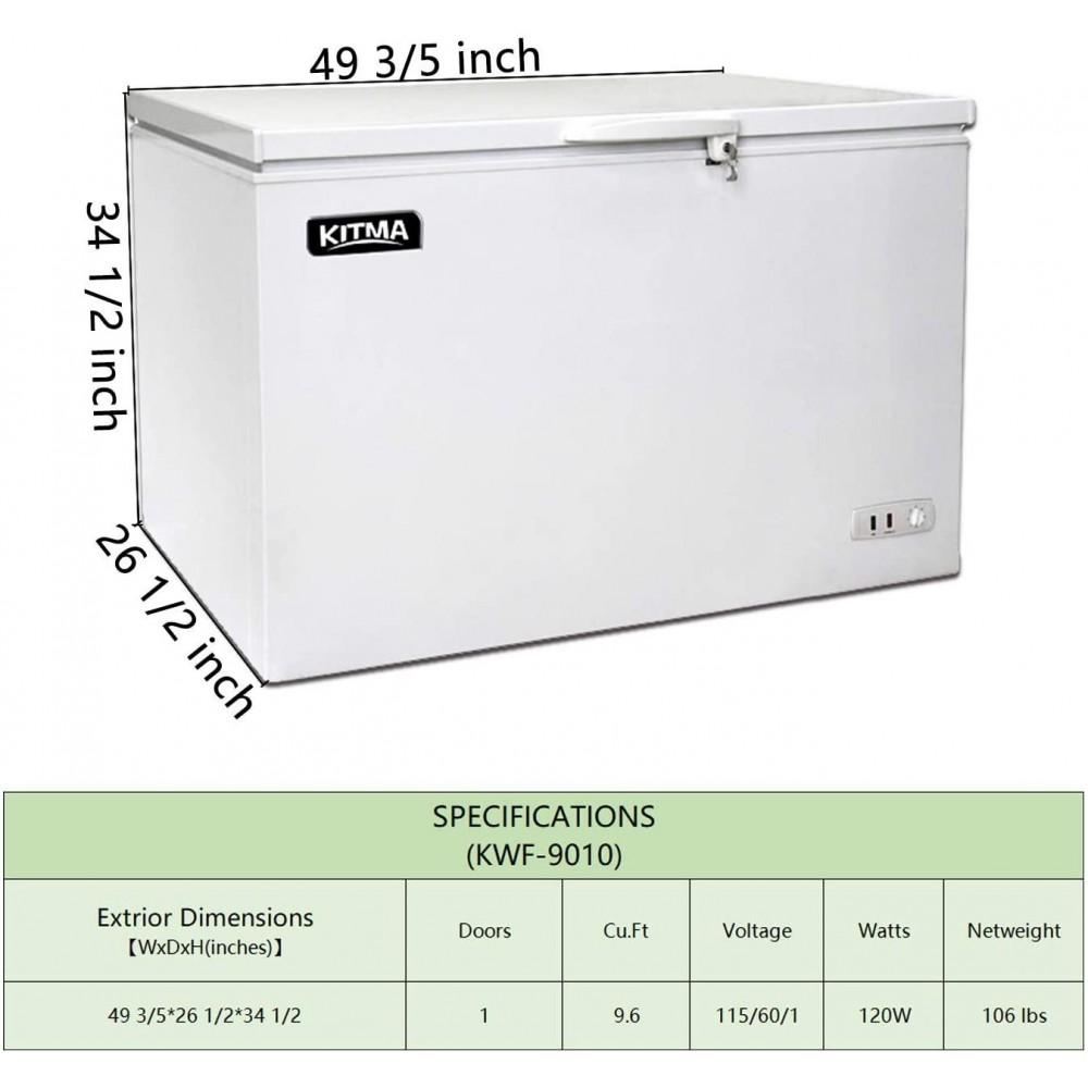 - 【9.6 Cu. Ft Capacity】Size : 40.5”×26.5”×32.5”, 9.6 Cu.Ft chest freezer has a 1-year warranty, and it is perfect for your large storage needs