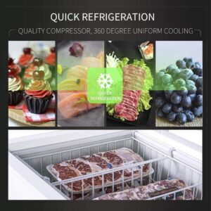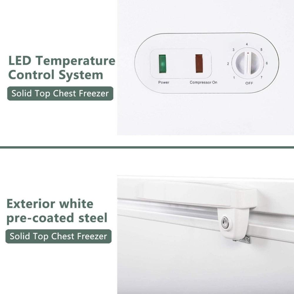 - 【Temperatu Control】This chest freezer foamed in place polyurethane insulation and environmentally friendly (R404A) refrigeration system, which provide temperature retention and structural strength, keep the temperature maintains between -10°F to -1°F
