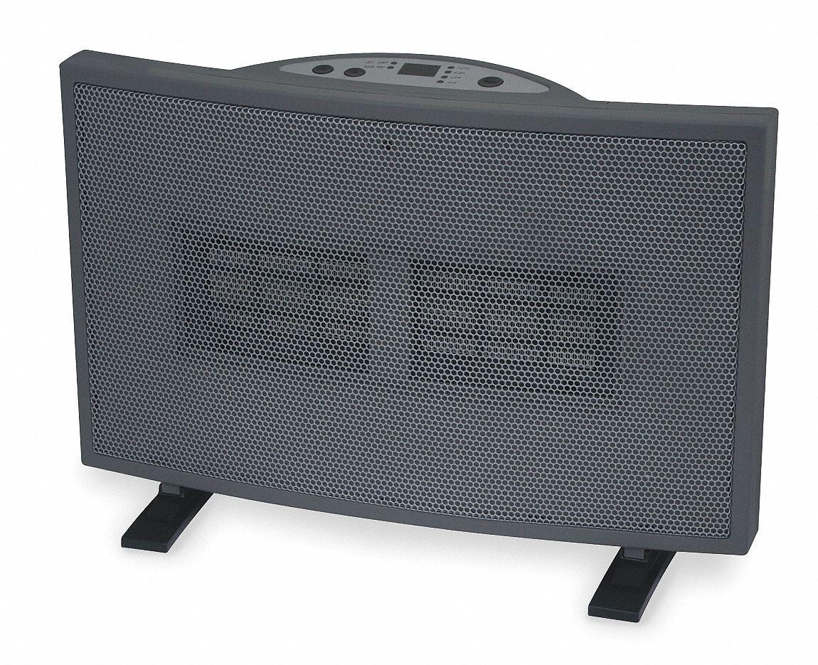 Portable Electric Heater, Non-Oscillating, Overall Height 10 3/8 in, Overall Width 15 3/8 in, Overall Depth 6 in, Number of Heat Settings 2, Key Features Mechanical Controls, Overheat Protection, Programming Capability Not Programmable, Remote Control Functions No Remote Control Included, Safety Tip-Over Switch Included No, Thermal Overheat Protection Manual Reset, Control Type Push Button, Heater Style Flat Panel, Heating Method Fan Forced, Wattage Output 900W/1500W, Housing Color Gray WARNING: Cancer and Reproductive Harm – –
