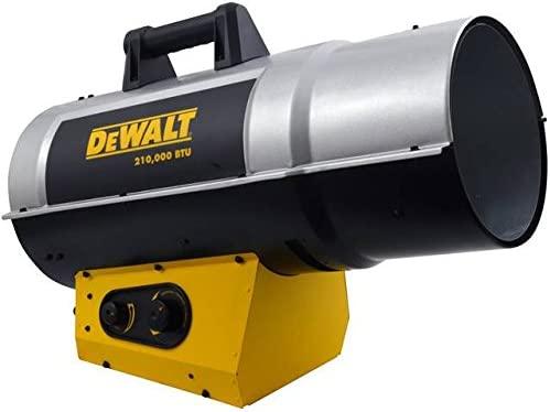 The thermostatically controlled DXH210FAVT forced air propane heater burns at 210,000 BTU/HR and can be adjusted down 160,000 BTU/HR. Equipped with Quiet Burner Technology this heater operates with 50% less noise than standard units of similar size. Includes a 20 Ft. hose and regulator, and is manufactured with a large ergonomic handle and a split barrel design for easy maintenance. When operated with 2 100 lb propane tanks you can heat approximately 5250 square feet of space for around 21 hours on high or 27 hours on low.