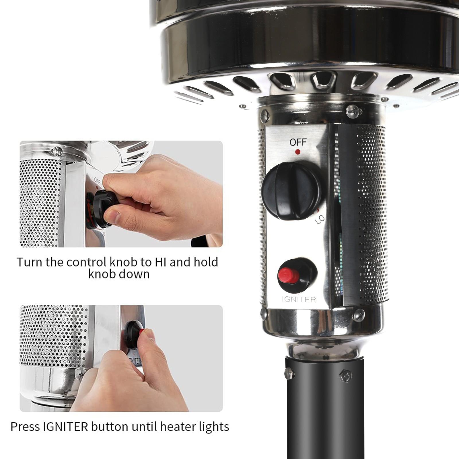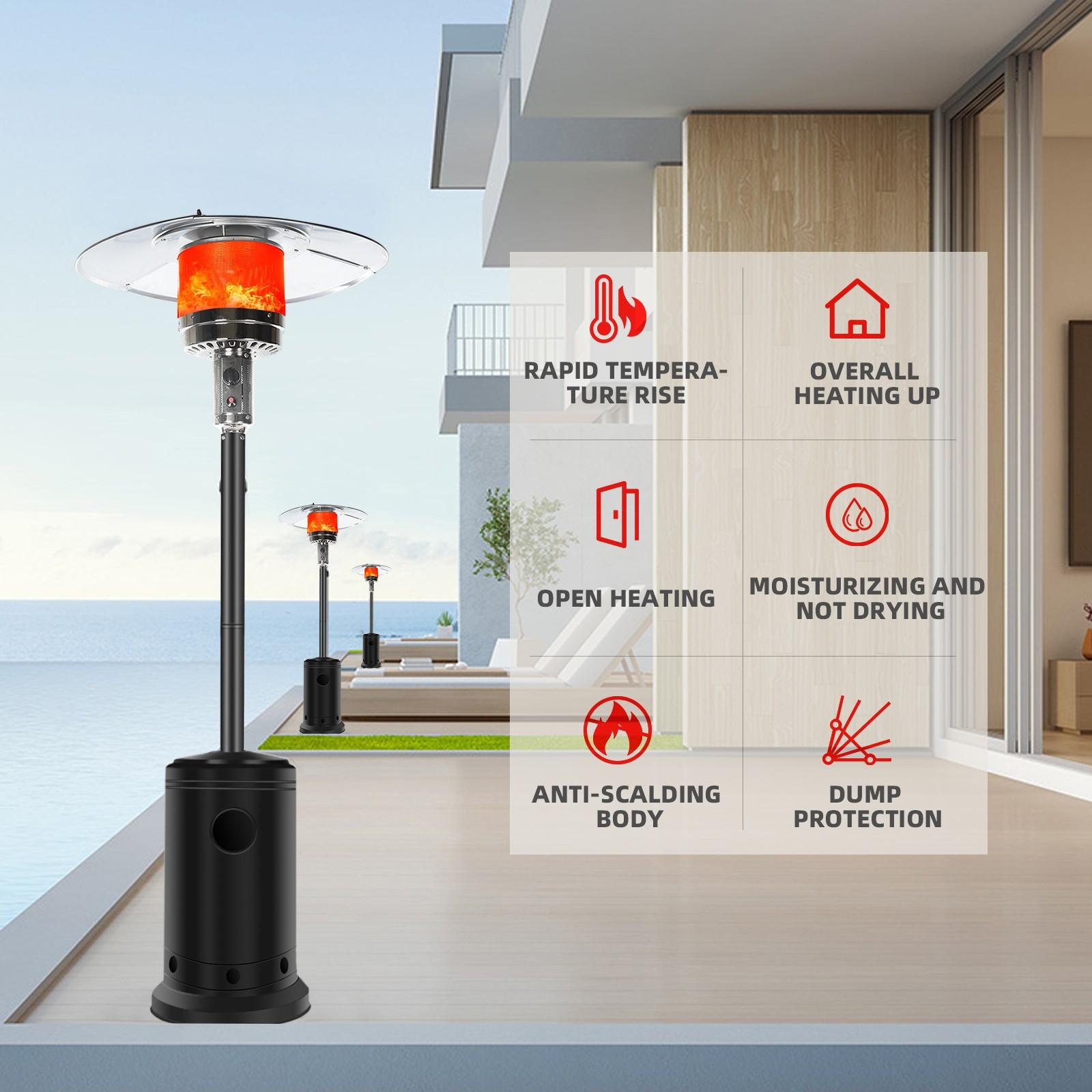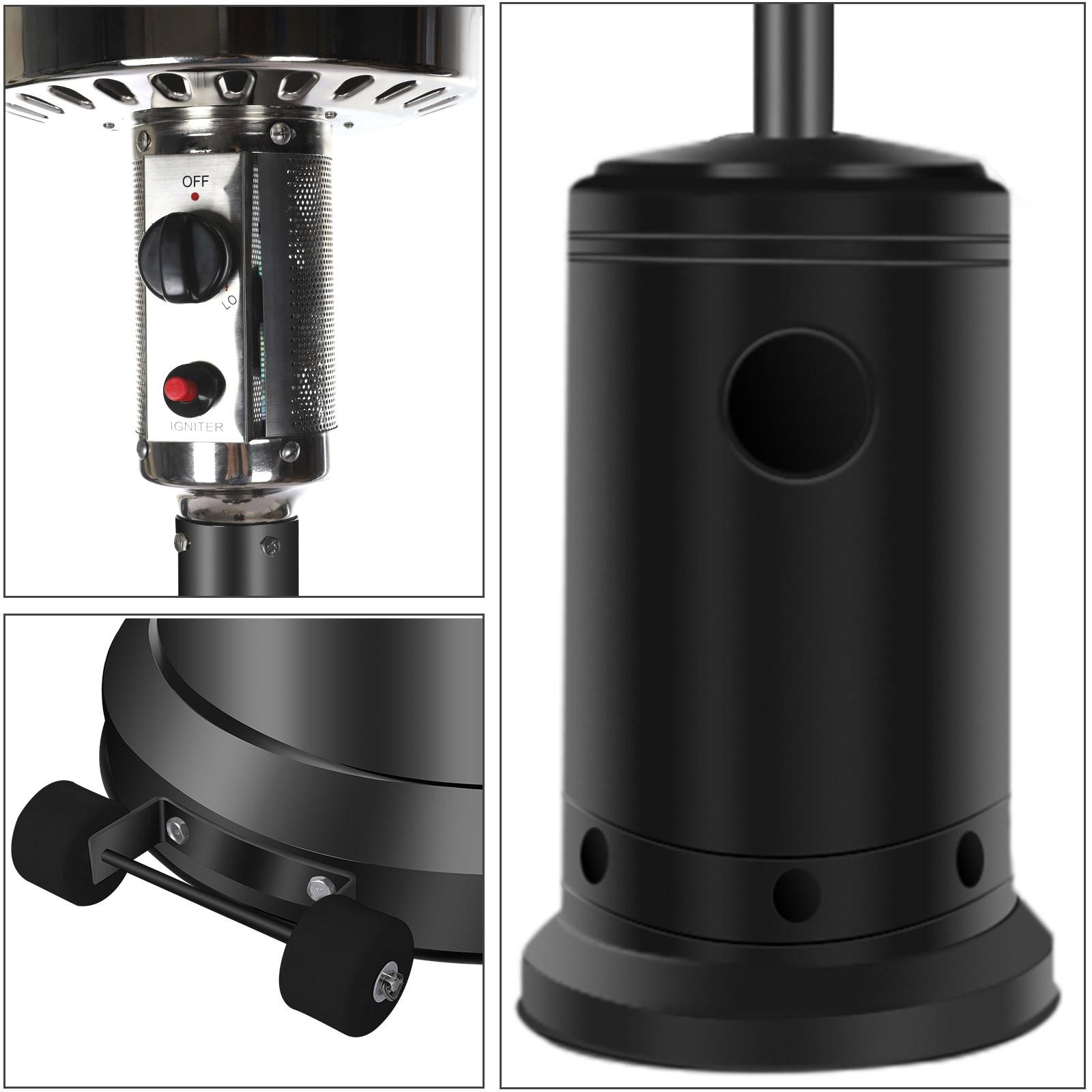 Outdoor Patio Heater With Wheels,Propane 46,000 BTU Premium Outdoor Patio Heater<br>Feature:<br>Commercial Type : Pumping out 46,000 BTUs for an 32.8-foot diameter heat range, these units are the most powerful patio heaters in the market. They can also be wheeled away, ensuring exceptional mobility despite their hefty size. Heavy duty yet gorgeous with a stylish finish options, they are perfect for serious outdoor entertainers with big spaces. Double support bar design can effectively save packaging size and make you worry less Simple Start: Up Piezo Ignition System -To operate, all it takes to light the heater is a simple push of the button thanks to its user-friendly, ONE-STE-P, Piezo ignition system<br>46,000 BTUs of Heat : The heavy-duty patio heater offers an impressive heat output of 46,000 BTUs. Mid-winter merry-making? No problem. Even more, the unit heats a wide area with a range of up to 32.8 feet in diameter. A nice alternative to a fire pit, the gas patio heater delivers quiet, soothing, consistent heat–with no smoke or open flames to worry about<br>Variable-heat control knob : Allows for low or high heat settings and for turning the heater completely off at the end of the night.<br>Wheels for Smooth Mobility :A wheel assembly with two smooth-rolling wheels comes included, making it easy to transport the outdoor heater from poolside to patio or from one side of the deck to the other; Heat Output: 46,000 BTU; Heat Range: 10m(32.8′ Radius) Patio heater:<br>Material: Iron with powder coated<br>Color: Black<br>Supply and exhaust mode: direct exhaust<br>Double support rod Power: 5-13kw<br>Heat dissipation range diameter: 10M<br>Gas consumption: 0.45kg/h-0.87kg/h<br>Ignition life: 50000 times<br>Temperature regulation: adjustable<br>Gas Type: Propane, Butane and mixtures (LPG) Heat output: 46,000BTU<br>Piezoelectric ignition<br>With Anti-tilt switch and automatic shut-off device Sectional/4-pc aluminum reflector<br>Hose&Regulator INCLUDED<br>Brown Carton. 1pc in 1 carton.<br>Product height: 221cm / 87 inch<br>Top cover diameter: 81cm / 31.8 inch<br>Package size: 77x46x46cm / 30.31×18.11×18.11 inch<br>GW/NW: 18.4KG/15KG<br>Certifications: CE&CSA<br>The Package Include:<br>1 x Patio heater<br>1 x Installation package<br>1 Pair of wheels<br>1 x Pressure reducing<br>valv-e<br>1 x Hose<br>1 x Instruction<br>