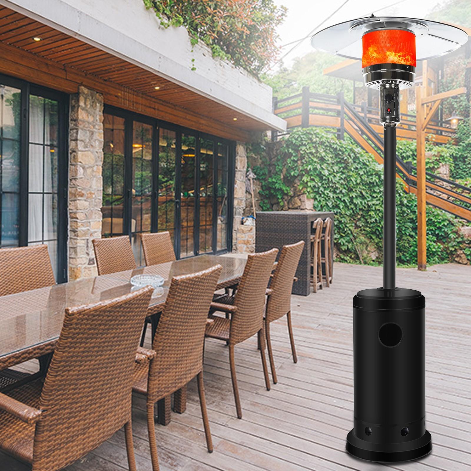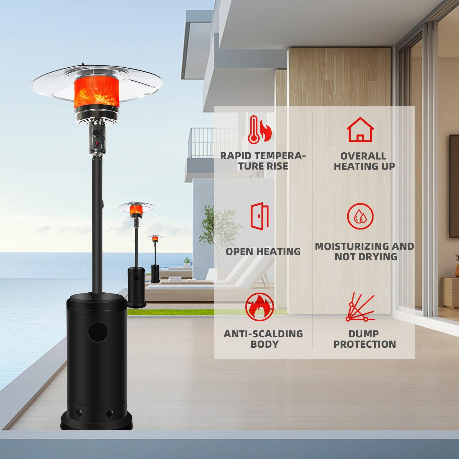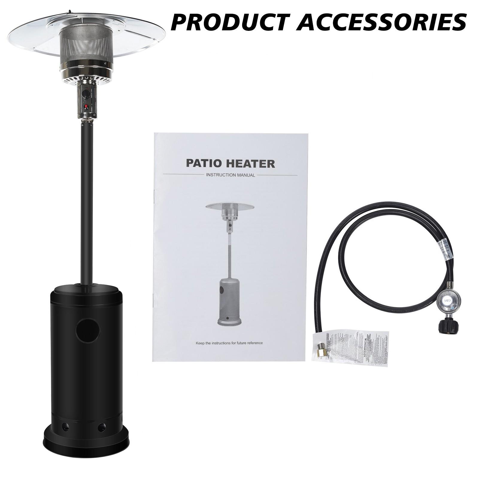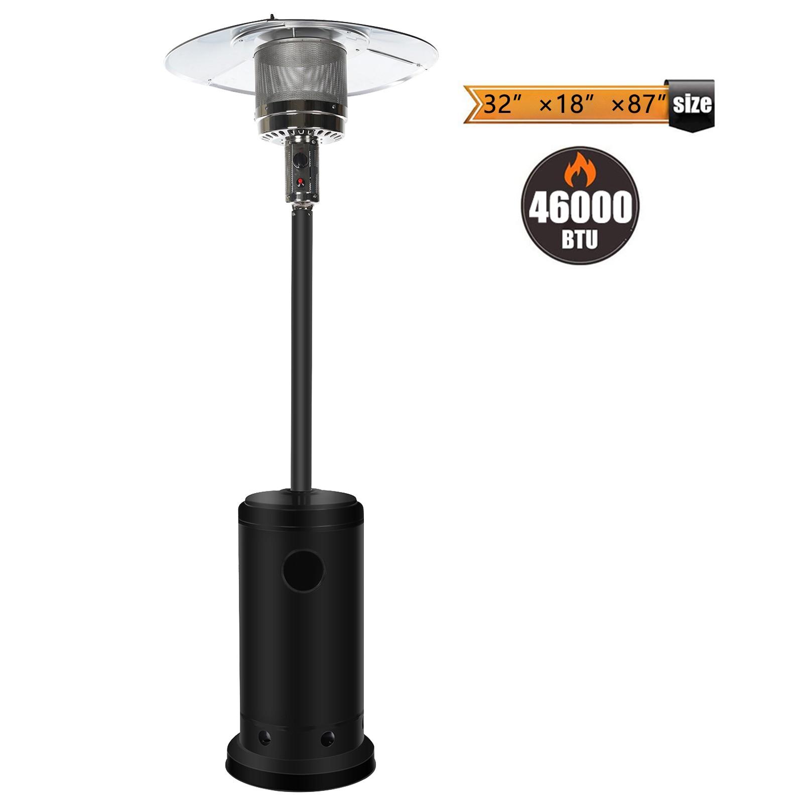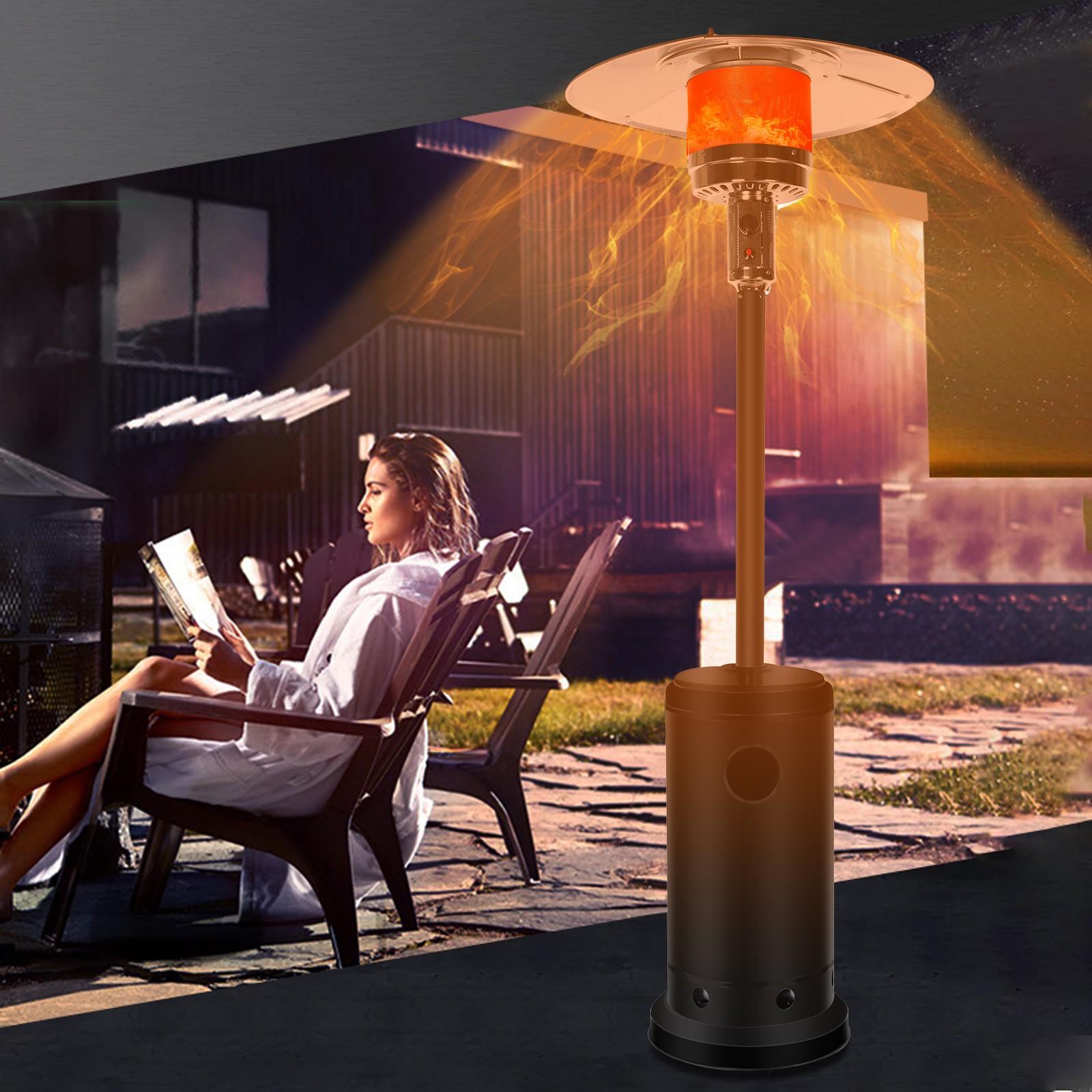 Outdoor Patio Heater With Wheels,Propane 46,000 BTU Premium Outdoor Patio Heater<br>Feature:<br>Commercial Type : Pumping out 46,000 BTUs for an 32.8-foot diameter heat range, these units are the most powerful patio heaters in the market. They can also be wheeled away, ensuring exceptional mobility despite their hefty size. Heavy duty yet gorgeous with a stylish finish options, they are perfect for serious outdoor entertainers with big spaces<br>Simple Start: Up Piezo Ignition System -To operate, all it takes to light the heater is a simple push of the button thanks to its user-friendly, ONE-STE-P, Piezo ignition system<br>46,000 BTUs of Heat : The heavy-duty patio heater offers an impressive heat output of 46,000 BTUs. Mid-winter merry-making? No problem. Even more, the unit heats a wide area with a range of up to 32.8 feet in diameter. A nice alternative to a fire pit, the gas patio heater delivers quiet, soothing, consistent heat–with no smoke or open flames to worry about<br>Variable-heat control knob : Allows for low or high heat settings and for turning the heater completely off at the end of the night.<br>Wheels for Smooth Mobility :A wheel assembly with two smooth-rolling wheels comes included, making it easy to transport the outdoor heater from poolside to patio or from one side of the deck to the other; Heat Output: 46,000 BTU; Heat Range: 10m(32.8′ Radius) Patio heater:<br>Material:Iron with powder coated<br>Supply and exhaust mode: direct exhaust<br>Power: 5-13kw<br>Heat dissipation range diameter: 10M<br>Gas consumption: 0.45kg/h-0.87kg/h<br>Ignition life: 50000 times<br>Temperature regulation: adjustable<br>Gas Type: Propane, Butane and mixtures (LPG) Heat output: 46,000BTU<br>Piezoelectric ignition With Anti-tilt switch and automatic shut-off device Sectional/4-pc aluminum reflector<br>Hose&Regulator INCLUDED<br>Brown Carton. 1pc in 1 carton.<br>CE and ETL certified Detailed size:<br>Total heater height: 221cm(H) /87 Inch Reflector dia.:81cm/31.88 Inch<br>Burner dia.: 27.8x53cm(H) /10.94×20.86 Inch Main pole: φ65x87cm/34.25 Inch(H)<br>Tank housing dia.: 37.8×76.5cm(H) /14.88×30.11 Inch Tank base dia.: 46×8.6cm(H)/18.11×3.38 Inch<br>Carton size 46x46x87cm<br>Net weight: 15kg/33.06 lbs<br>Gross weight: 17kg/37.47 lbs<br>The Package Include:<br>1 x Patio Propane Heater<br>1 x Tool kit<br>1 x Pair of wheels<br>1 x Pressure reducing valv-e(US)<br>1 x Hose<br>1 x Use Manual<br> <br>