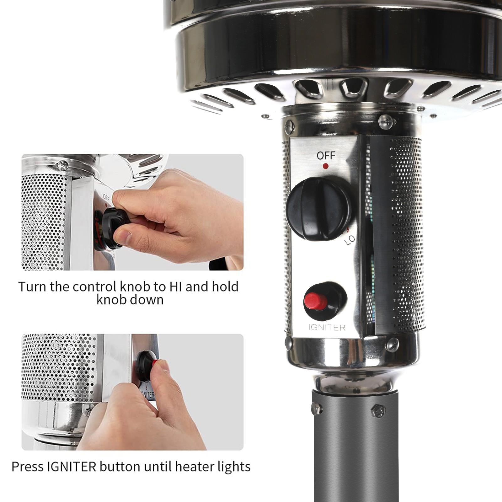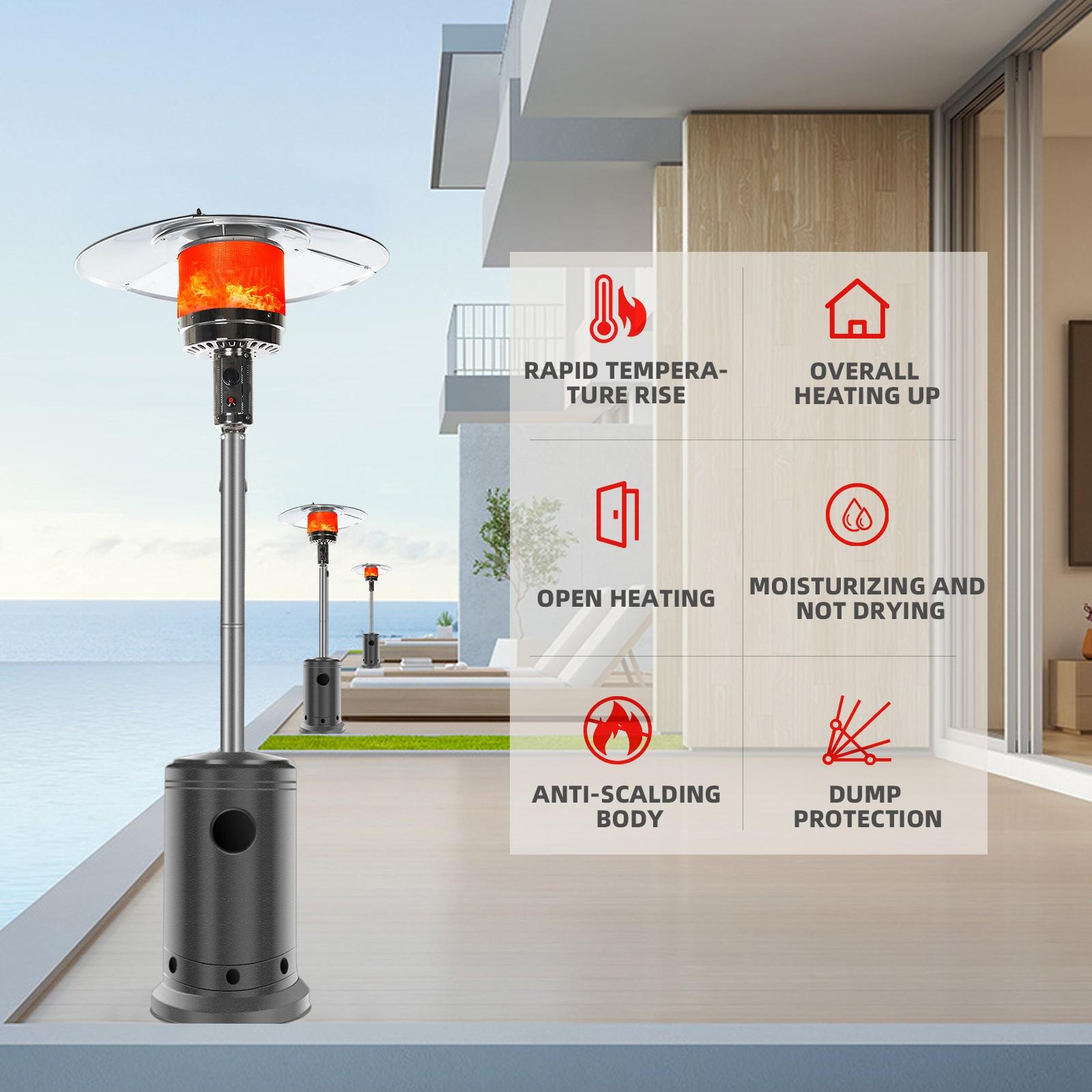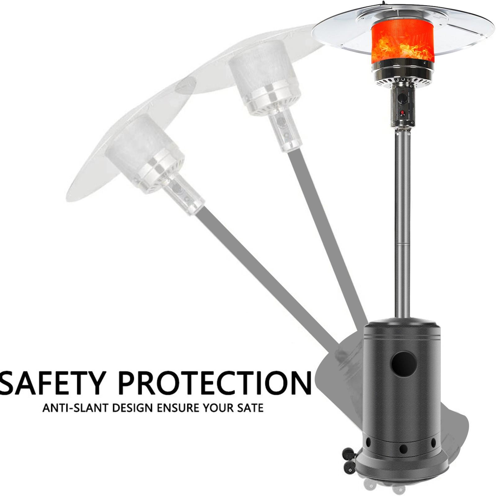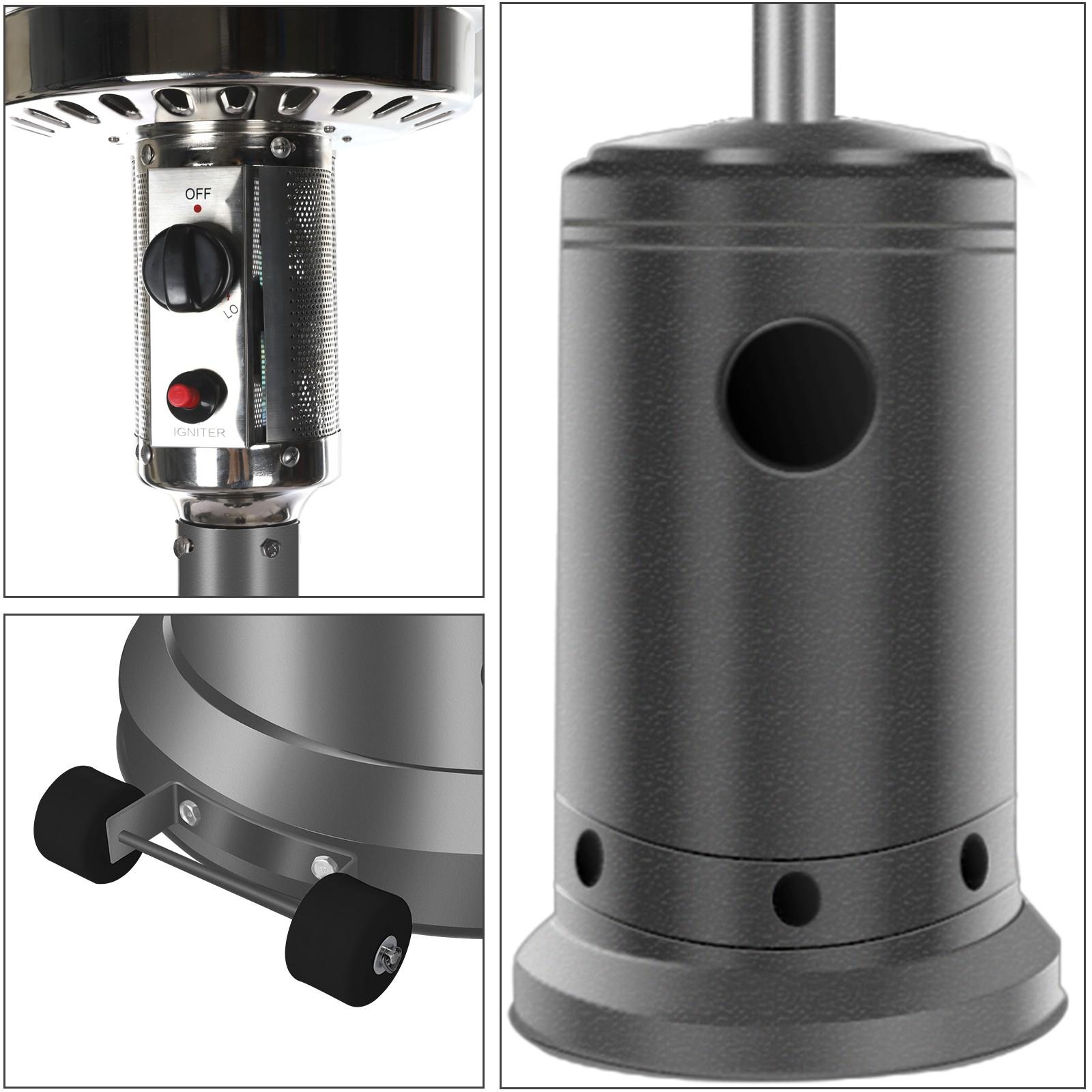 Outdoor Patio Heater With Wheels,Propane 46,000 BTU Premium Outdoor Patio Heater<br>Feature:<br>Commercial Type : Pumping out 46,000 BTUs for an 32.8-foot diameter heat range, these units are the most powerful patio heaters in the market. They can also be wheeled away, ensuring exceptional mobility despite their hefty size. Heavy duty yet gorgeous with a stylish finish options, they are perfect for serious outdoor entertainers with big spaces. Double support bar design can effectively save packaging size and make you worry less Simple Start: Up Piezo Ignition System -To operate, all it takes to light the heater is a simple push of the button thanks to its user-friendly, ONE-STE-P, Piezo ignition system<br>46,000 BTUs of Heat : The heavy-duty patio heater offers an impressive heat output of 46,000 BTUs. Mid-winter merry-making? No problem. Even more, the unit heats a wide area with a range of up to 32.8 feet in diameter. A nice alternative to a fire pit, the gas patio heater delivers quiet, soothing, consistent heat–with no smoke or open flames to worry about<br>Variable-heat control knob : Allows for low or high heat settings and for turning the heater completely off at the end of the night.<br>Wheels for Smooth Mobility :A wheel assembly with two smooth-rolling wheels comes included, making it easy to transport the outdoor heater from poolside to patio or from one side of the deck to the other; Heat Output: 46,000 BTU; Heat Range: 10m(32.8′ Radius) Patio heater:<br>Material: Iron with powder coated<br>Color: Gray<br>Supply and exhaust mode: direct exhaust<br>Double support rod Power: 5-13kw<br>Heat dissipation range diameter: 10M<br>Gas consumption: 0.45kg/h-0.87kg/h<br>Ignition life: 50000 times<br>Temperature regulation: adjustable<br>Gas Type: Propane, Butane and mixtures (LPG) Heat output: 46,000BTU<br>Piezoelectric ignition<br>With Anti-tilt switch and automatic shut-off device Sectional/4-pc aluminum reflector<br>Hose&Regulator INCLUDED<br>Brown Carton. 1pc in 1 carton.<br>Product height: 221cm / 87 inch<br>Top cover diameter: 81cm / 31.8 inch<br>Package size: 77x46x46cm / 30.31×18.11×18.11 inch<br>GW/NW: 18.4KG/15KG<br>Certifications: CE&CSA<br>The Package Include:<br>1 x Patio heater<br>1 x Installation package<br>1 Pair of wheels<br>1 x Pressure reducing<br>valv-e<br>1 x Hose<br>1 x Instruction<br>