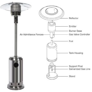 Outdoor Patio Heater With Wheels,Propane 46,000 BTU Premium Outdoor Patio Heater<br>Feature:<br>Commercial Type : Pumping out 46,000 BTUs for an 32.8-foot diameter heat range, these units are the most powerful patio heaters in the market. They can also be wheeled away, ensuring exceptional mobility despite their hefty size. Heavy duty yet gorgeous with a stylish finish options, they are perfect for serious outdoor entertainers with big spaces<br>Simple Start: Up Piezo Ignition System -To operate, all it takes to light the heater is a simple push of the button thanks to its user-friendly, one-step, Piezo ignition system<br>46,000 BTUs of Heat : The heavy-duty patio heater offers an impressive heat output of 46,000 BTUs. Mid-winter merry-making? No problem. Even more, the unit heats a wide area with a range of up to 32.8 feet in diameter. A nice alternative to a fire pit, the gas patio heater delivers quiet, soothing, consistent heat–with no smoke or open flames to worry about<br>Variable-heat control knob : Allows for low or high heat settings and for turning the heater completely off at the end of the night.<br>Wheels for Smooth Mobility :A wheel assembly with two smooth-rolling wheels comes included, making it easy to transport the outdoor heater from poolside to patio or from one side of the deck to the other; Heat Output: 46,000 BTU; Heat Range: 10m(32.8′ Radius) Patio heater:<br>Material:304 Stainless Steel<br>Supply and exhaust mode: direct exhaust<br>Power: 5-13kw<br>Heat dissipation range diameter: 10M<br>Gas consumption: 0.45kg/h-0.87kg/h<br>Ignition life: 50000 times<br>Temperature regulation: adjustable<br>Gas Type: Propane, Butane and mixtures (LPG) Heat output: 46,000BTU<br>Piezoelectric ignition With Anti-tilt switch and automatic shut-off device Sectional/4-pc aluminum reflector<br>Hose&Regulator INCLUDED<br>Brown Carton. 1pc in 1 carton.<br>CE and ETL certified Detailed size:<br>Total heater height: 221cm(H) /87 Inch Reflector dia.:81cm/31.88 Inch<br>Burner dia.: 27.8x53cm(H) /10.94×20.86 Inch Main pole: φ65x87cm/34.25 Inch(H)<br>Tank housing dia.: 37.8×76.5cm(H) /14.88×30.11 Inch Tank base dia.: 46×8.6cm(H)/18.11×3.38 Inch<br>Carton size 46x46x87cm/18.11×18.11×34.25 Inch<br>Net weight: 15kg/33.06 lbs<br>Gross weight: 17kg/37.47 lbs<br>The Package Include:<br>1 x Patio Propane Heater<br>1 x Tool kit<br>1 x Pair of wheels<br>1 x Pressure reducing valv-e(US)<br>1 x Hose<br>1 x Use Manual<br>