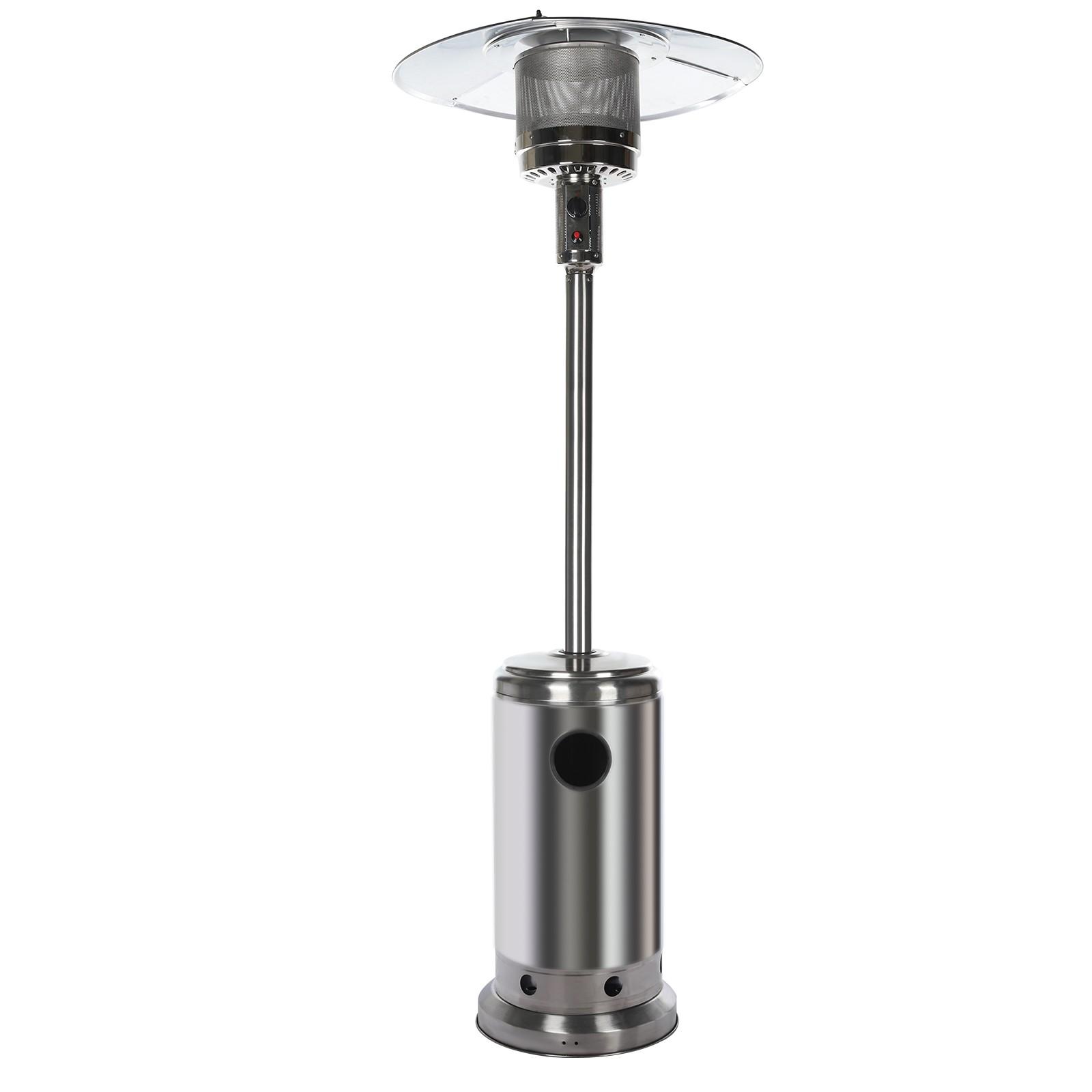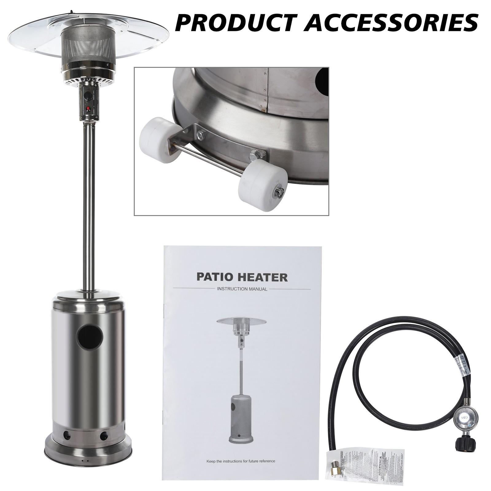Outdoor Patio Heater With Wheels,Propane 46,000 BTU Premium Outdoor Patio Heater<br>Feature:<br>Commercial Type : Pumping out 46,000 BTUs for an 32.8-foot diameter heat range, these units are the most powerful patio heaters in the market. They can also be wheeled away, ensuring exceptional mobility despite their hefty size. Heavy duty yet gorgeous with a stylish finish options, they are perfect for serious outdoor entertainers with big spaces<br>Simple Start: Up Piezo Ignition System -To operate, all it takes to light the heater is a simple push of the button thanks to its user-friendly, one-step, Piezo ignition system<br>46,000 BTUs of Heat : The heavy-duty patio heater offers an impressive heat output of 46,000 BTUs. Mid-winter merry-making? No problem. Even more, the unit heats a wide area with a range of up to 32.8 feet in diameter. A nice alternative to a fire pit, the gas patio heater delivers quiet, soothing, consistent heat–with no smoke or open flames to worry about<br>Variable-heat control knob : Allows for low or high heat settings and for turning the heater completely off at the end of the night.<br>Wheels for Smooth Mobility :A wheel assembly with two smooth-rolling wheels comes included, making it easy to transport the outdoor heater from poolside to patio or from one side of the deck to the other; Heat Output: 46,000 BTU; Heat Range: 10m(32.8′ Radius) Patio heater:<br>Material:304 Stainless Steel<br>Supply and exhaust mode: direct exhaust<br>Power: 5-13kw<br>Heat dissipation range diameter: 10M<br>Gas consumption: 0.45kg/h-0.87kg/h<br>Ignition life: 50000 times<br>Temperature regulation: adjustable<br>Gas Type: Propane, Butane and mixtures (LPG) Heat output: 46,000BTU<br>Piezoelectric ignition With Anti-tilt switch and automatic shut-off device Sectional/4-pc aluminum reflector<br>Hose&Regulator INCLUDED<br>Brown Carton. 1pc in 1 carton.<br>CE and ETL certified Detailed size:<br>Total heater height: 221cm(H) /87 Inch Reflector dia.:81cm/31.88 Inch<br>Burner dia.: 27.8x53cm(H) /10.94×20.86 Inch Main pole: φ65x87cm/34.25 Inch(H)<br>Tank housing dia.: 37.8×76.5cm(H) /14.88×30.11 Inch Tank base dia.: 46×8.6cm(H)/18.11×3.38 Inch<br>Carton size 46x46x87cm/18.11×18.11×34.25 Inch<br>Net weight: 15kg/33.06 lbs<br>Gross weight: 17kg/37.47 lbs<br>The Package Include:<br>1 x Patio Propane Heater<br>1 x Tool kit<br>1 x Pair of wheels<br>1 x Pressure reducing valv-e(US)<br>1 x Hose<br>1 x Use Manual<br>
