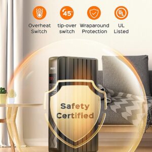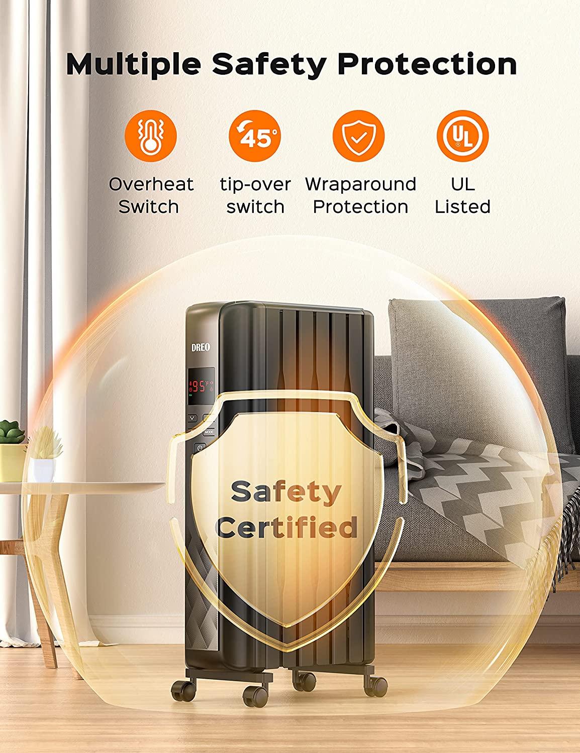 - Enhanced Safety: Dreo Oil Filled Radiator Heater made of V0 flame retardant materials was certified by UL. Built-in tip-over switch, Dreo Oil-filled heater will automatically shut off while tip-over by accident to ensure you and your family are safe and worry-