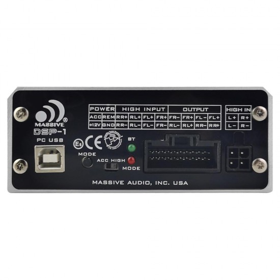 The DSP–1 is a unique/span>combination of a Four Channel amplifier and a Digital Signal Processor in one/span>piece. We have used uncompromising design and engineering that Massive Audio customers are accustomed to, incorporating the latest in small format/span>technology. Not only do you get a high performance, high quality product, but you also are saving a lot of space. The same proven quality of Massive Audio lives on in the new DSP–1.