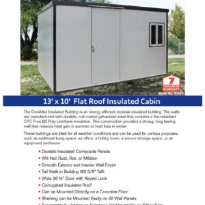 The Duramax Insulated Flat Roof Building is an energy efficient modular insulated building. Walls are manufactured with durable coil-coated galvanized steel that sandwiches a fire-retardant CFC-Free Poly-Urethane insulation. This construction provides a strong, long-lasting wall that reduces heat gain in summer or heat loss in winter.