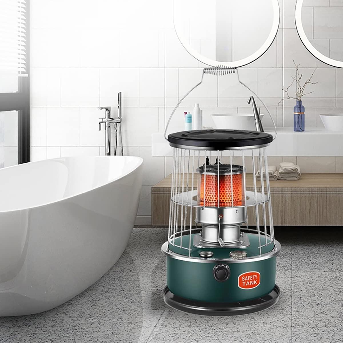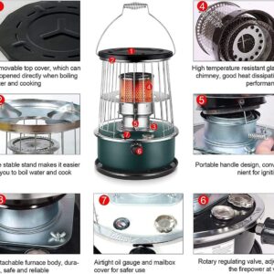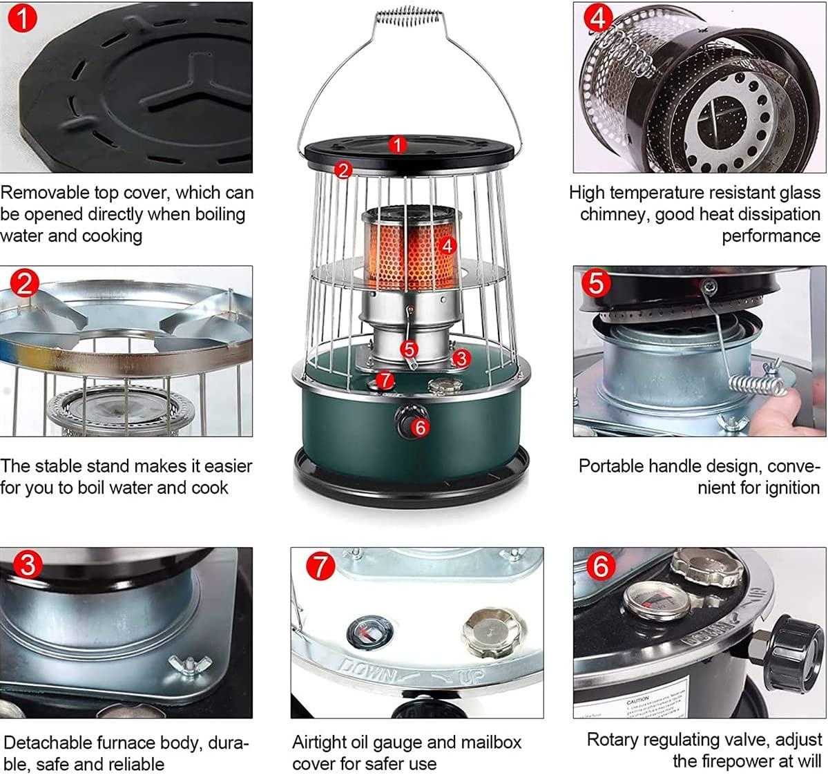 - ★Fire Power Adjustment Knob: The kerosene heater has a rotary adjusting valve to adjust the fire power according to your needs; no noise and glare, easy to use. The heating station on top can be used as a work station to cook food. There is a protective net outside the small kerosene stove to effectively prevent burns.