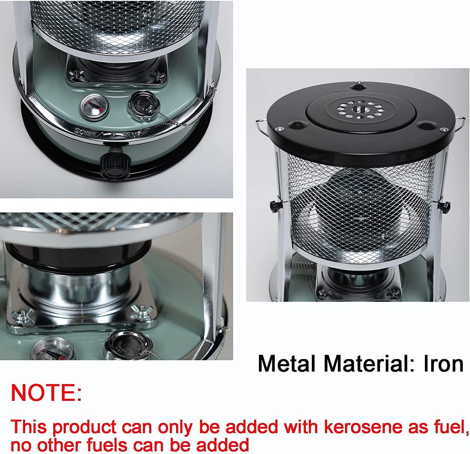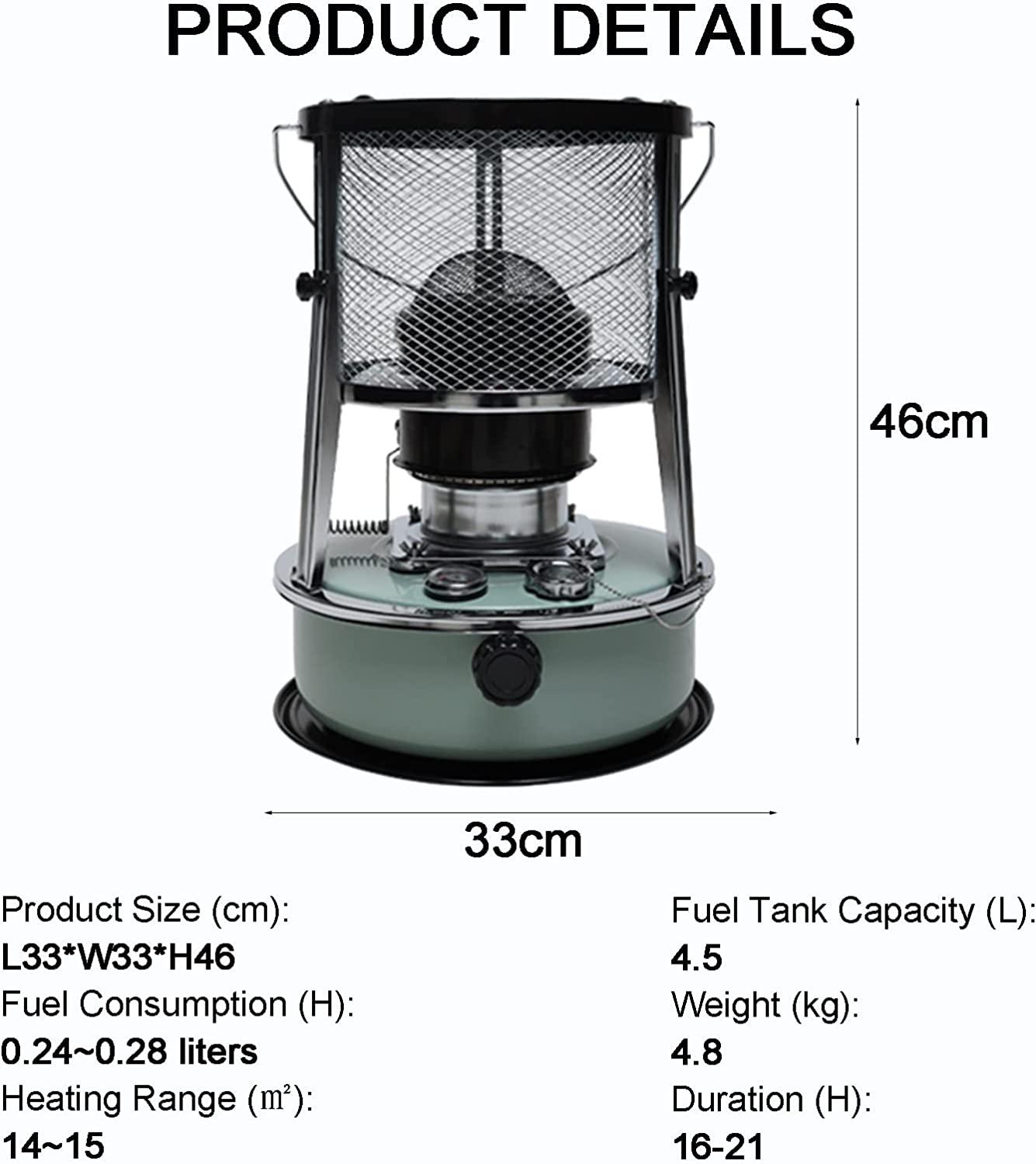 - ENERGY SAVING PROTECTION DESIGN:Camping heater does not need electricity. Just add kerosene acts as an emergency heater, fuel consumption of 0.25 liters per hour. Continuous heating time is 16-20 hours