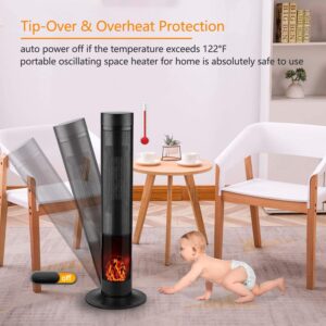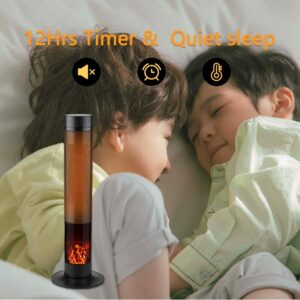 Electric Tower Space Heater 12h Timer Shaking Angle Tip-Over and Overheat Protection with Remote Control and Simulated Flame size 11.8″*11.8″*21.2″