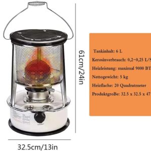 - ☛ High calorific value: the maximum heating output of 4.6L/6L kerosene furnace is 9000-10000 BTU/H, the fuel consumption is 0.2~0.25 liters/hour, and the heating area is about 20-25 square meters. Excellent emergency heat source to heat up the space quickly.