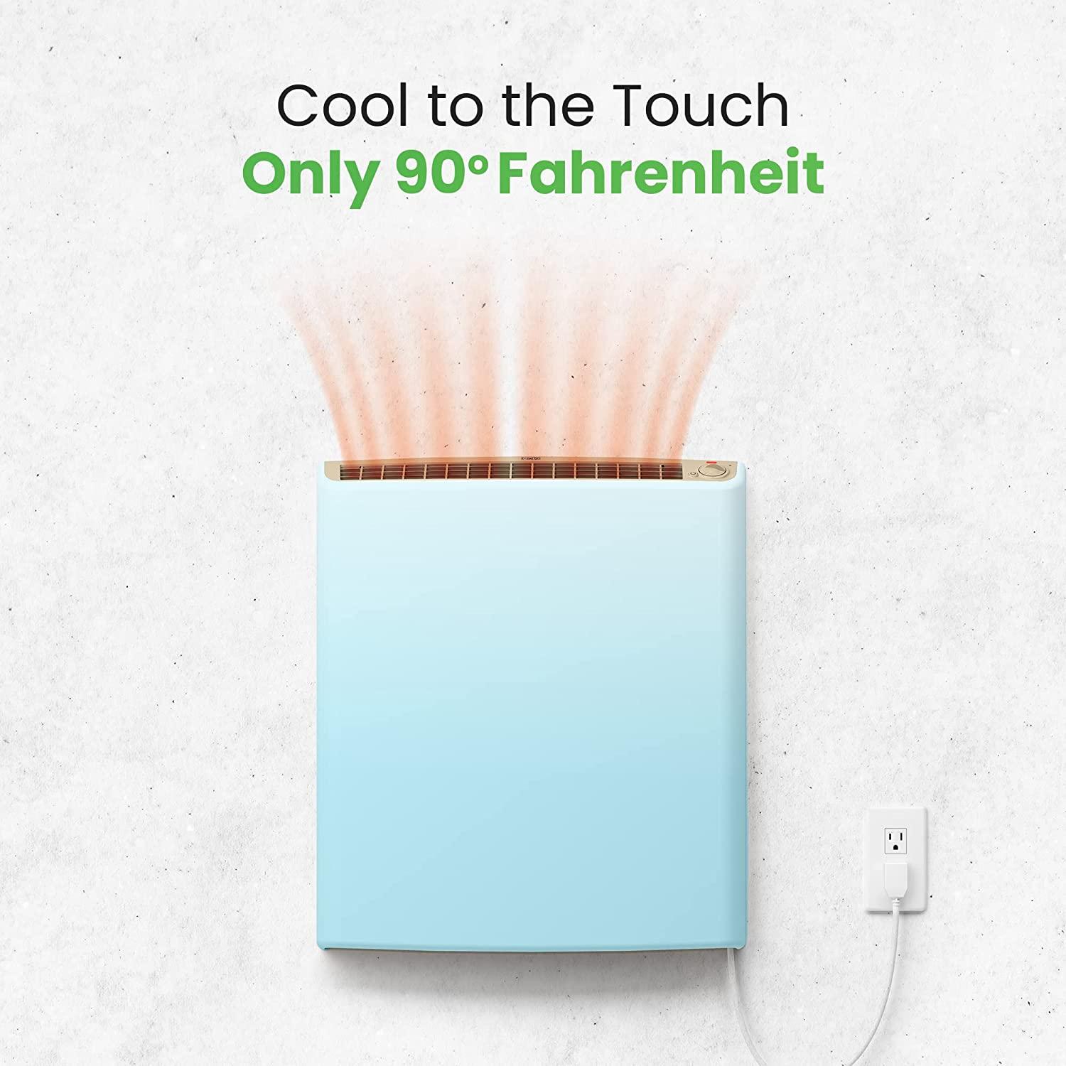 - COOL TO THE TOUCH AT ONLY 90 DEGREES FAHRENHEIT WITH WALL-SENS SAFETY SENSOR TO CUT POWER IF THE HEATER IS REMOVED FROM THE WALL.Can be left running 24/7 for peace of mind to protect children, the elderly and pets. Doesn’t blow dust or allergens around a room, creating a cleaner, healthier environment for allergy sufferers and those with respiratory problems. Doesn’t dry out the air thus reducing winter nose bleeds and dry eye syndrome.