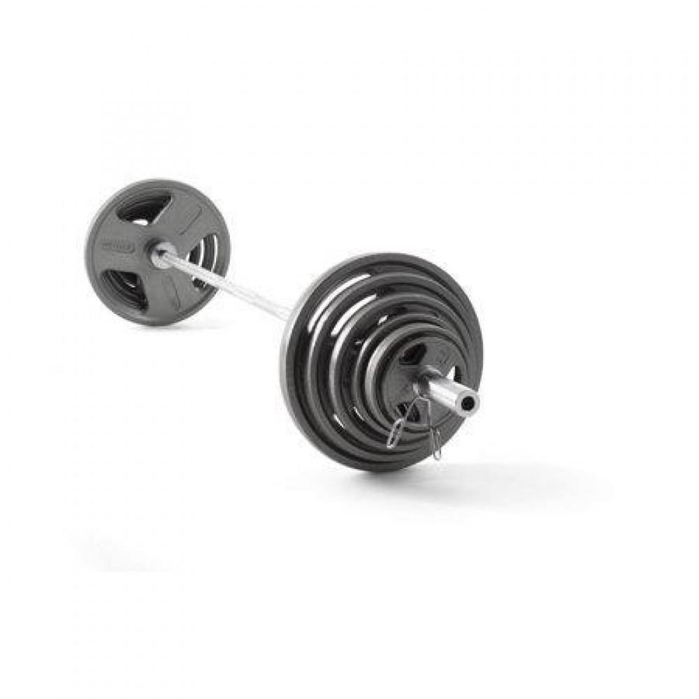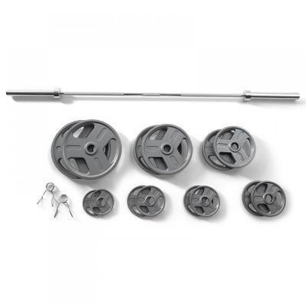 Upgrade your home gym with the Golds Gym 300 weight set with Olympic plates. This barbell weight set is designed to improve your weight training routine with versatility and convenience. This simple yet effective piece of fitness equipment boasts a 7 Olympic bar with Olympic spring collars and a wide variety of weight plates for a challenging workout that accommodates all fitness levels.