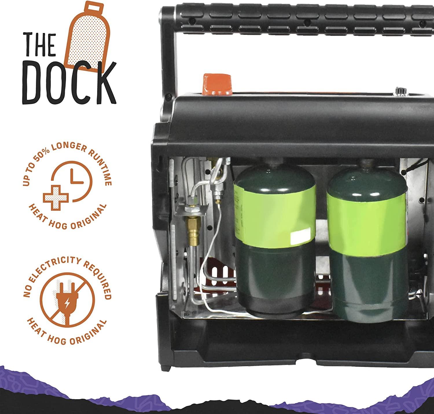 - The Dock: The colder the LP, the fewer BTUs you get. That’s why you can never use all the LP in a cylinder, that stinks! Heat Hog’s patent pending Dock keeps your cylinder warm allowing you to use all your LP, even in extreme cold weather! Fewer cylinders used, more heat, and warmer piggies.