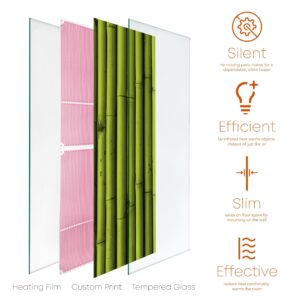 The Heat storm 16” x 48” premium decorative glass heat panel is a lovely decoration piece to add to the decor of any home, while providing gentle and energy efficient heat to any room or workspace. Our wall mounted glass mural heaters come in a wide array of high definition photo art to fit the look or style of any room. Heat storm wall mounted glass panel heaters use energy efficient and highly effective radiant heat to cut down on power consumption and are made without moving components to add to the long life of this beautiful unit. The heater is completely silent and has built in safety features to provide a quiet, but safe heat. The glass heaters are ideal for a 200 sq. foot room.