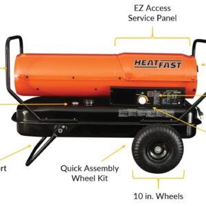 The HeatFast HF215K 215,000 BTU Forced Air Heater provides hours of comfort for your jobsite, barn, or Wherever You Need To Bring The Heat. This high output torpedo heater provides strong, powerful, and dependable heat for areas up to 5,100 sq. feet and has been tested to sub zero temperatures to insure it is ready for all winter weather conditions. This kerosene forced air heater is field tested for several types of fuel including kerosene, diesel, home heating oil, and jet fuel (WARNING: DO NOT USE GASOLINE) and can operate for 8 hours due to its large 13.2 gallon fuel tank. Additional convenient features include the SMART Diagnostics digital readout which provide error codes for easy trouble shooting, built in air pressure gauge, and a convenient easy pour tilted fuel fill.