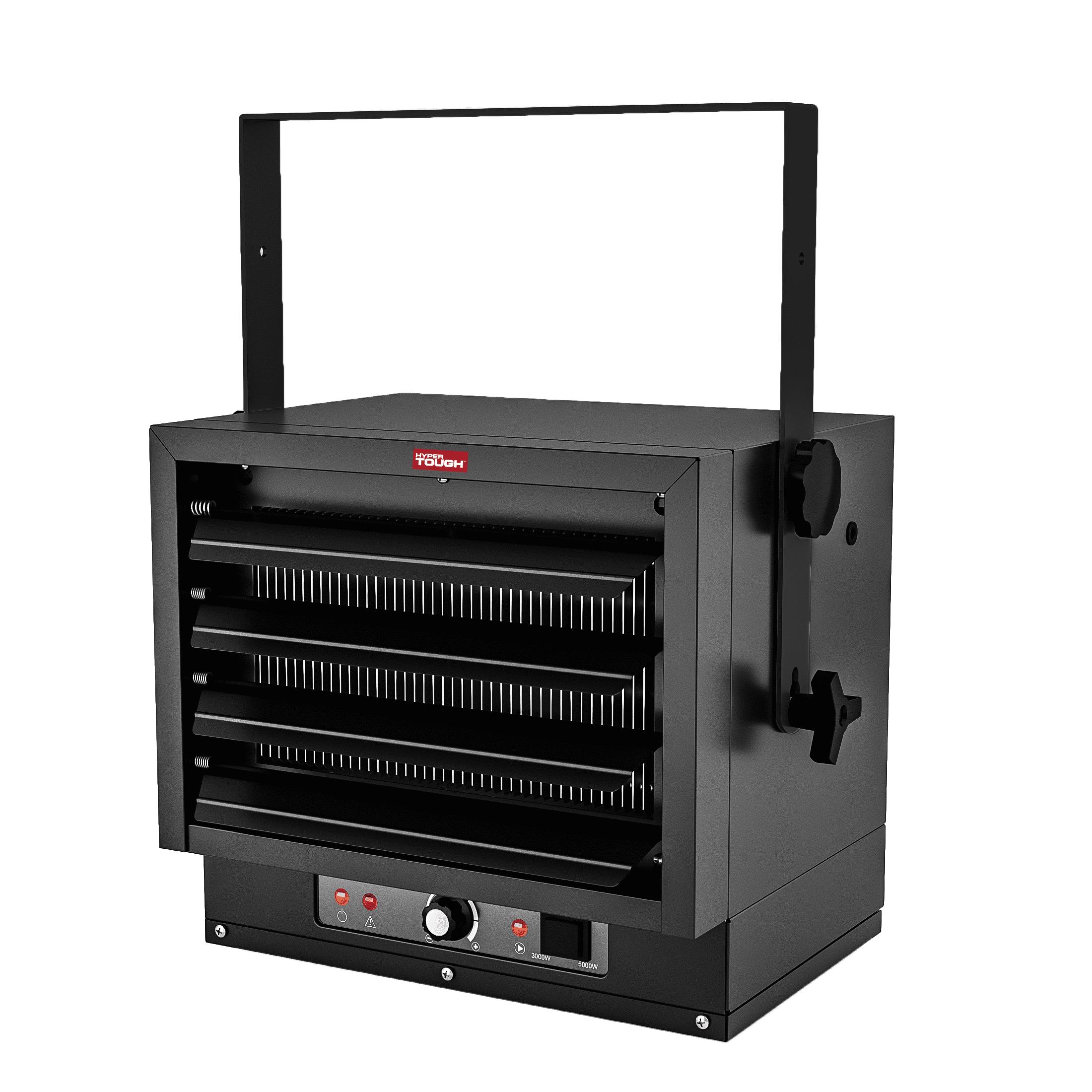 Create a comfortable, warm environment with this Hyper Tough Black 7500w Electric Space Heater that comes with a remote. This heater is ideal for your workspace or in your garage. It mounts on the ceiling and is designed for use in harsh environments. Warm air is forced out of the heater by a fan. By adjusting the integrated vent plates, you can target specific areas with heat and get wide heat coverage in the space . Crafted with a tough heavy gauge steel body, this heater can stand up to sudden temperature drops and continued low temperatures. The adjustable thermostat control offers a range of temperatures. Press the buttons on the heater or use the remote control from a distance to easily adjust the temperature. The 12-hour timer allows the user to run the heater for a set amount of time instead of switching it on and off manually. A power light and a caution light indicator let users know when the heater is operating or when there is a need to check on the heaters function. For safety, the heater is also equipped with an automatic shut off in the event the unit were to overheat.