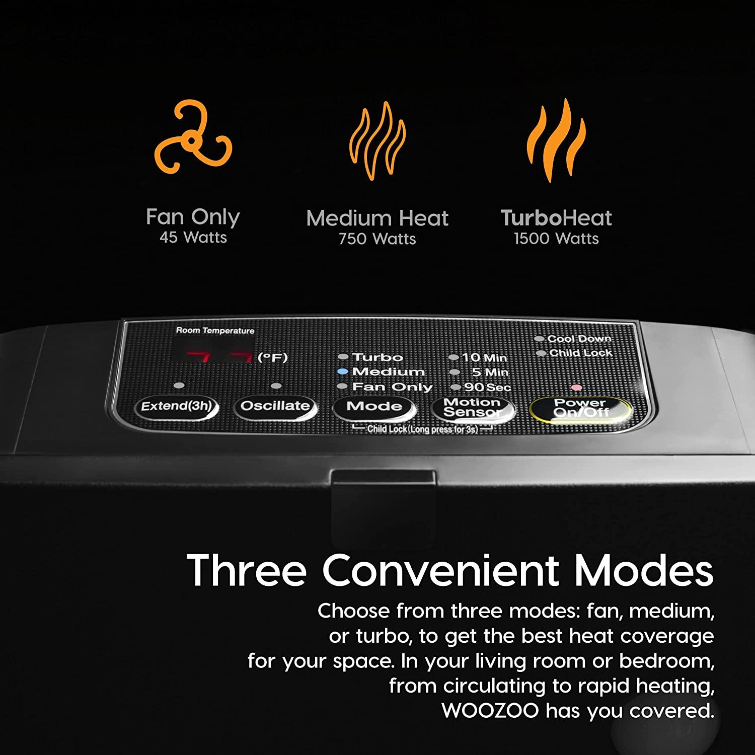 - THREE 3 FAN MODES: Fan/Medium/Turbo Max. 200 sq ft coverage From circulating air in the room to rapidly heating it; three available fan modes help enrich your environment, whether in a living room or bedroom