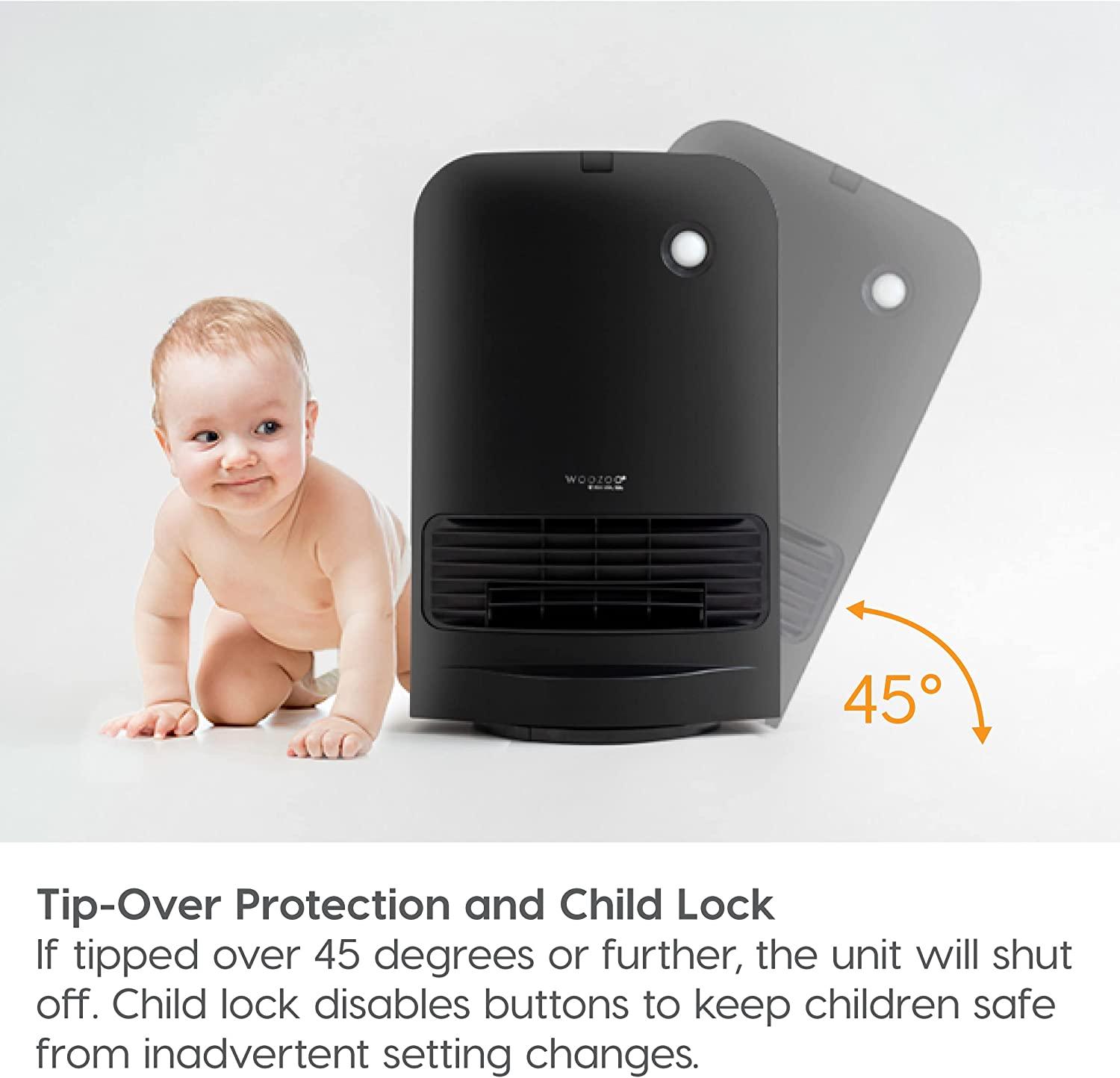 - CHILD SAFETY LOCK: Installed to protect small children from heat burns. Parents can use this heater without worrying about extra supervison. Pressing and holding 2 buttons on the control panel will activate/deactivate the child lock