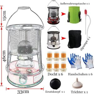 - 【Package quantity】 Kerosene heater*1, storage bag*1, spare wick*6, spare rotation*1, funnel*1, oil pump*1, gloves*2.