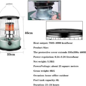 - [High calorific value]: The maximum calorific value of the petroleum furnace is 9000 BTU/H (corresponding to 3000 W), and the fuel consumption per hour is 0.25 liters. It can quickly add about 20 square meters of space. Comes with a storage bag and spare accessories for easy portability.