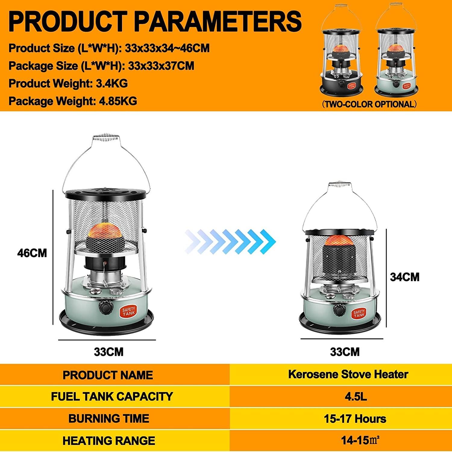 - 【High Calorific Value】: The kerosene warmer has a large heating range. The maximum calorific value is 7800-8900 kcal/hour, and the oil consumption is 0.25L per hour.