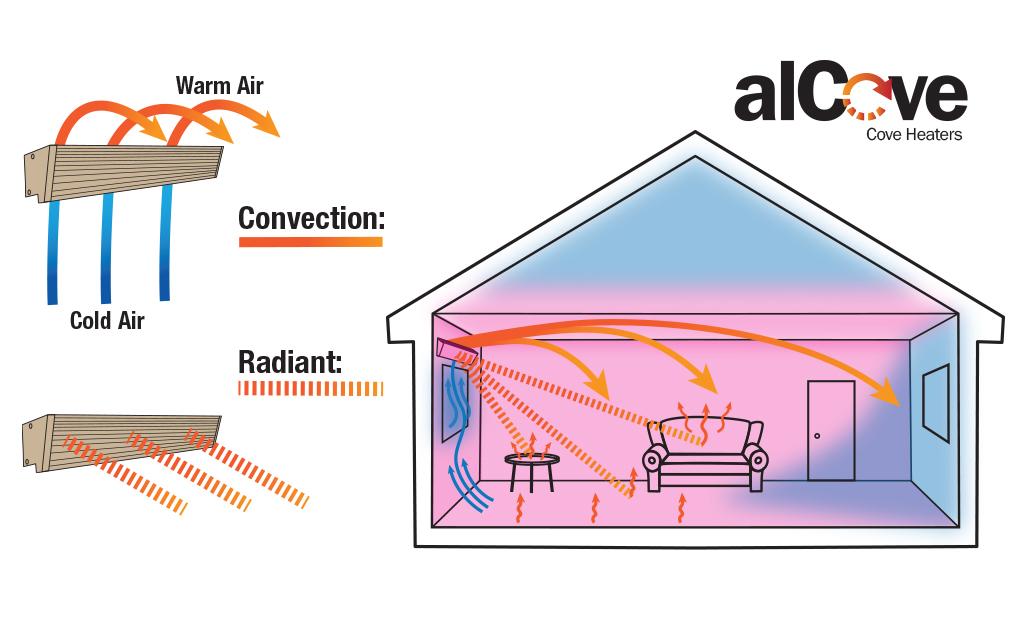 The King Electric alCove or KCV Series cove heater provides warmth from above. A space-saving radiant heater that also produces convection heat by heating the air similar to a baseboard. By combining the quick comfort of radiant heat along with the sustained warmth of convection heat, warm air is uniformly dispersed throughout the room. The cove heater is mounted near the ceiling, eliminating furniture placement problems. Surface temperatures are lower than baseboard or fan heaters, making a pleasant form of heat similar to older ceiling cable heating systems. With no moving parts this heater is quiet and maintenance free. Typical uses are day care centers, assisted living housing, housing developments, laundry rooms, bathrooms, bedrooms.