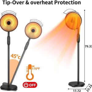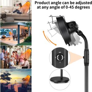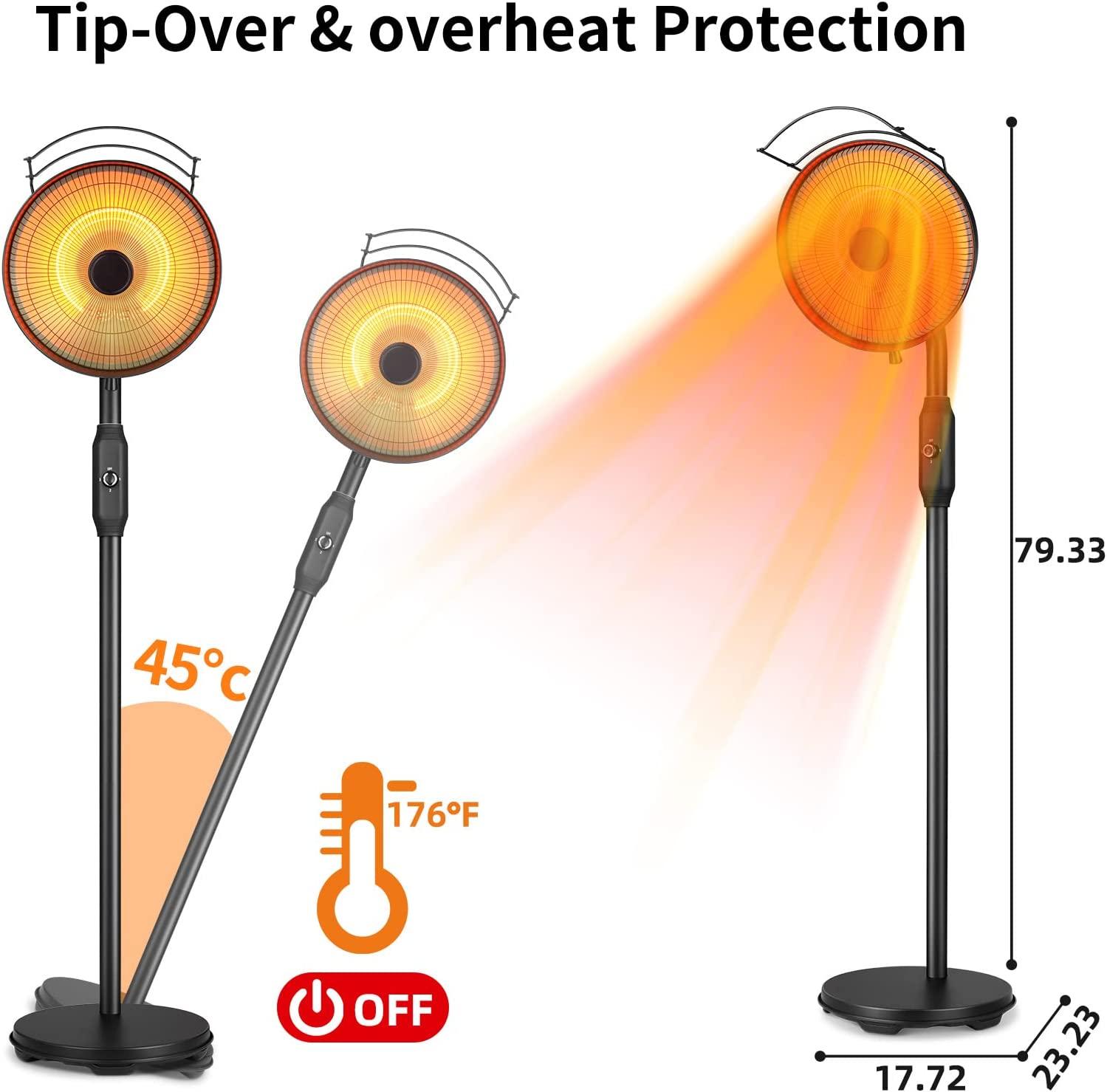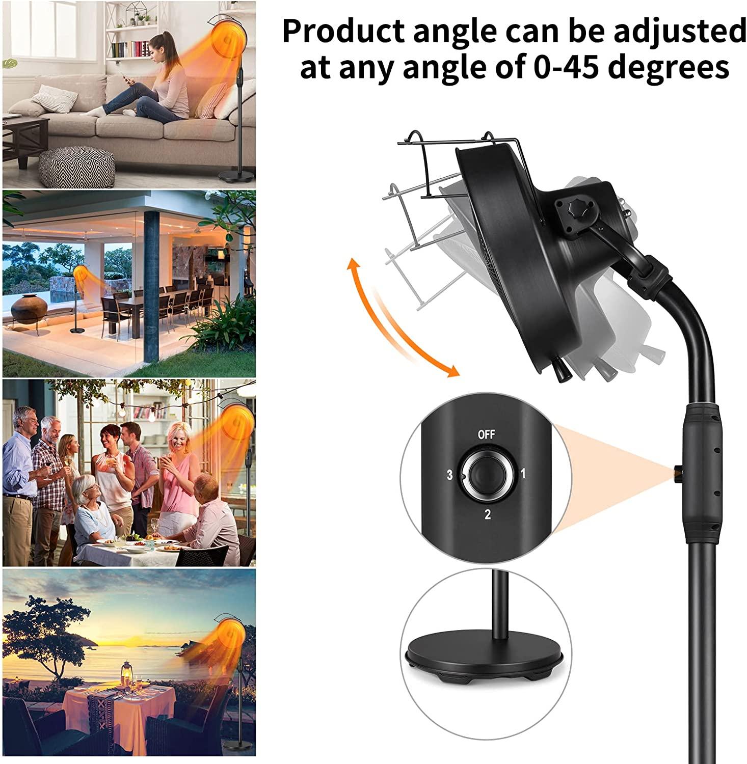 - Product Specification : Electric patio heater with rotary switch control, 45 degree adjustable heating head, height is 79.33 “. This patio heater is quiet when working, it does not disturb you resting or working, always creating a warm and quiet area for you.