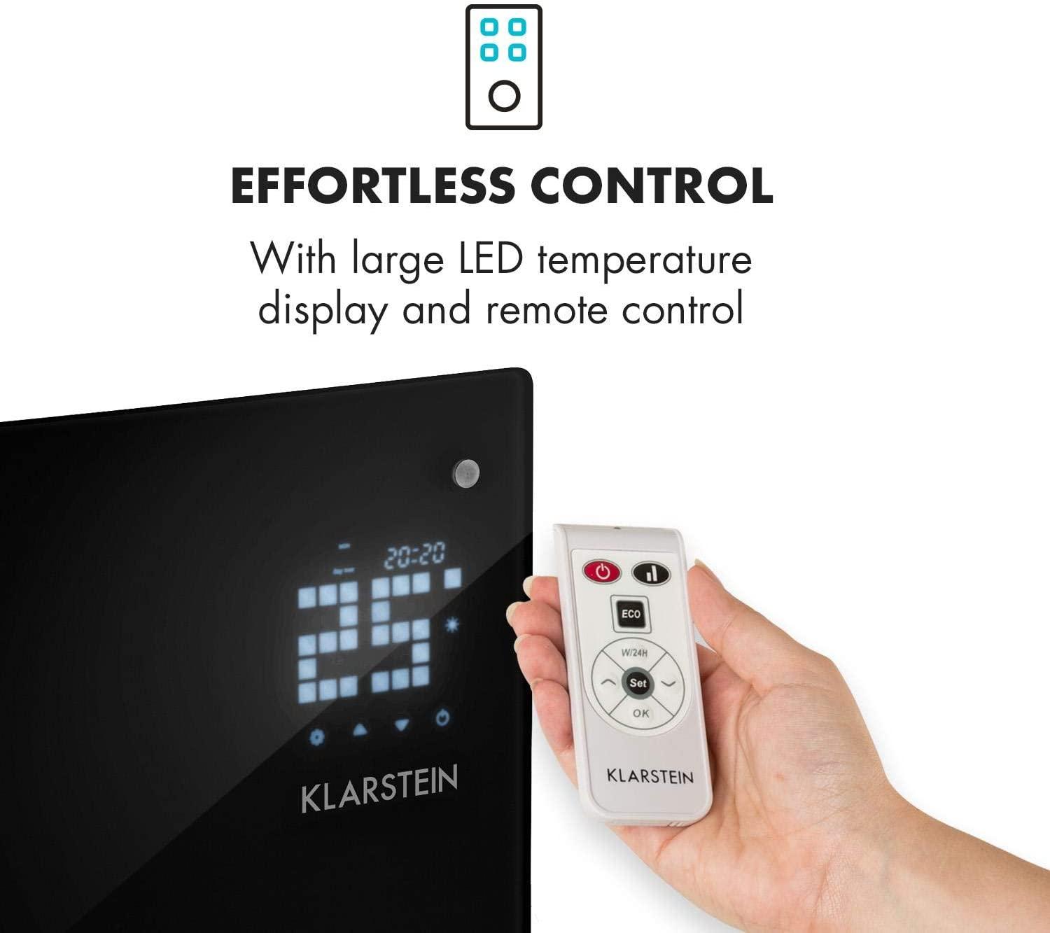 - EFFORTLESS CONTROL: If you are comfortably lounging on the sofa, there is no need to leave the cosy cushion landscape: the included remote control allows convenient operation of the Klarstein holm Curve convection heating device from a distance.